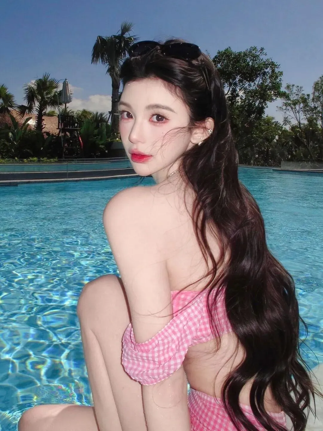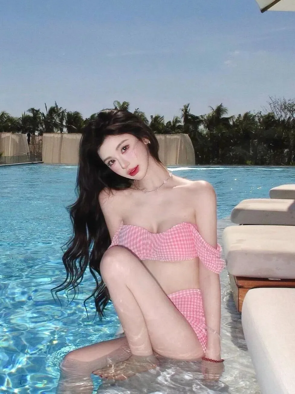 📷池水漫过脚踝,风卷着夏日的甜意。粉白格纹裹住少女的鲜活,露肩设计轻勾锁骨线条,黑发在波光里漫成温柔的浪。阳光碎在肌肤上,连呼吸都浸着度假的松弛与浪漫。