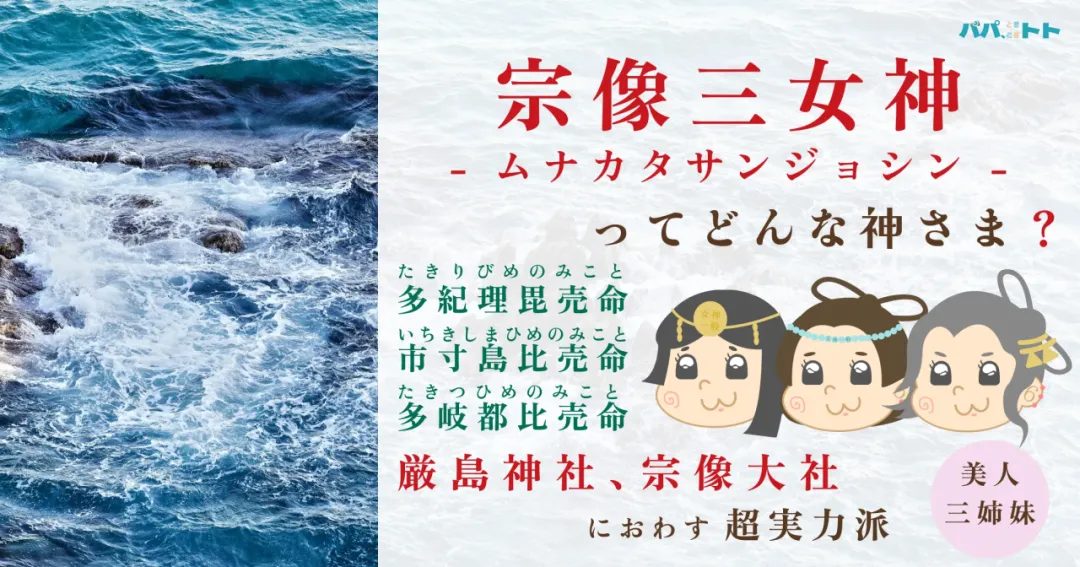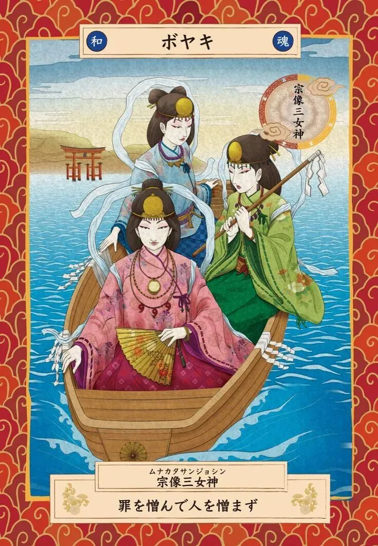 根据日本最早的史书《古事记》(712 年)与《日本书纪》(720 年)记载,天照大神曾与弟弟须佐之男命(素戋呜尊)产生意见分歧,于是夺下须佐之男命(素戋呜尊)的剑,将其一分为三,在圣泉中一一净化后,放入口中嚼碎,从吹出的气息中生出了三个女儿——祂们就是宗像三女神。长女多纪理毘卖命、“田心姬神”的名字意为“雾”,供奉在远方冲之岛上的冲津宫;次女市寸岛比卖命、“湍津姬神”意为“漩流”,供奉在大岛上的中津宫;幼女市寸岛比卖命、“市杵岛姬神”意为“神宿之岛”,被供奉于九州本岛上的边津宫。