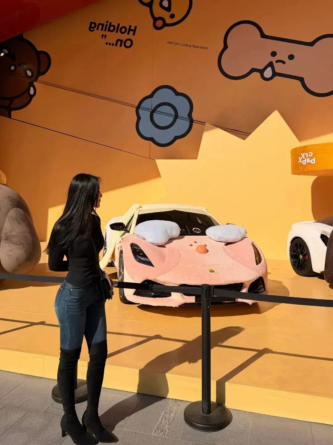 斜挎包以黑色为主色,过膝靴也属于这一色系的一种,所以在色彩方面看起来更加的考究些。旁边停着一辆粉色毛绒跑车,有可爱的小熊,与她这身酷酷的打扮不搭调。这股甜酷风真的越来越盛行,它既不会太过幼稚,也不会过于硬朗,恰到好处。
