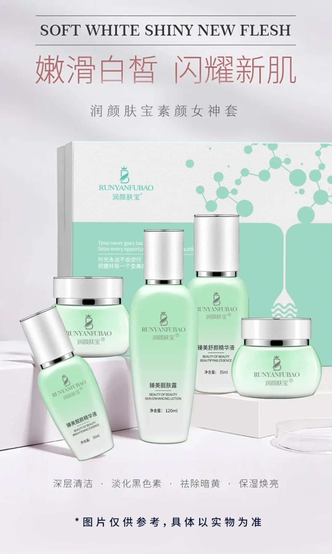 润颜肤宝素颜女神套,蕴含高活性焕亮精粹,像精准的“橡皮擦”,层层渗透,阻断黑色素转运。它不是粗暴地漂白,而是温和地还原肌底净澈。早晚坚持,你会看见那些若隐若现的斑点逐渐变淡,肤色从内而外透出匀净光泽。无需厚重粉底遮盖,这张干净的脸,就是你最好的名片。