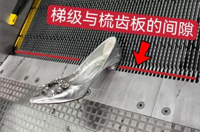 细高跟鞋鞋跟面积较小,稍不注意就可能会卡在电梯间隙,从而导致身体失衡摔倒造成人身伤害。因此,在穿着此类鞋踏入直梯时,需确保鞋跟完全落在电梯轿厢内的平整地面上,避免卡在电梯轿厢地坎与层门地坎的间隙;在乘坐扶梯时,应选择鞋跟与扶梯间隙适配的位置站立,避免鞋跟卡在梯级与梳齿板的间隙。