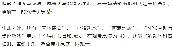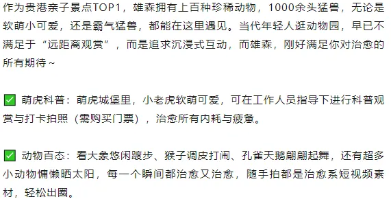 ✅ 投喂互动:购买专用饲料,近距离投喂长颈鹿、大象、羊驼、熊等萌宠,感受它们的温柔,随手抓拍投喂瞬间,软萌感爆棚;老虎可隔玻璃投喂,看它们慵懒进食,解锁不一样的互动体验;还可体验骑马的快乐~
