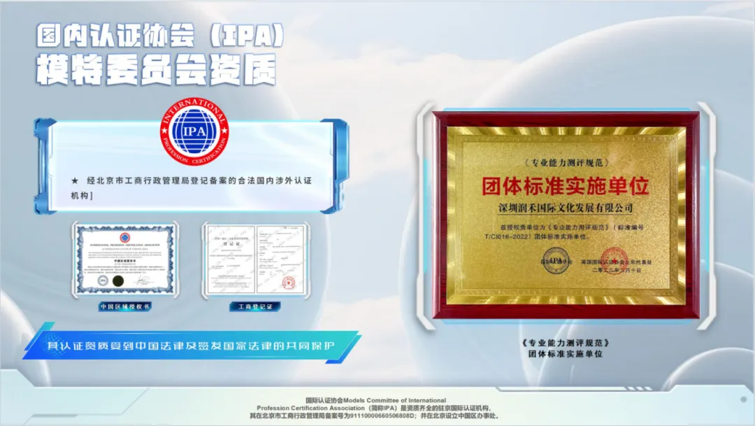 IPA模特委员会拥有全国团体标准授予的《专业能力测评规范》,是国家认可的团体标准实施单位,并得到多个国家的大使馆认证和签字原文件,受到世界各国政府的广泛认证认可。是国际国内资质的双认可!