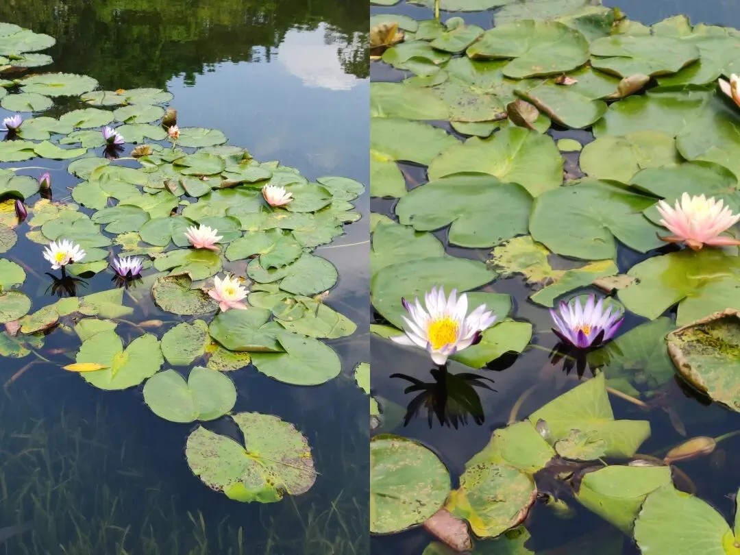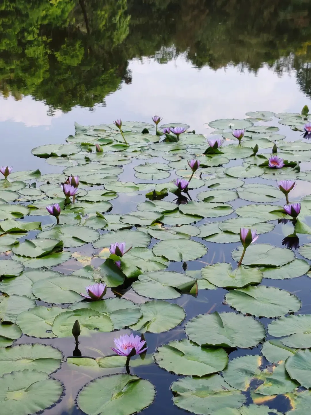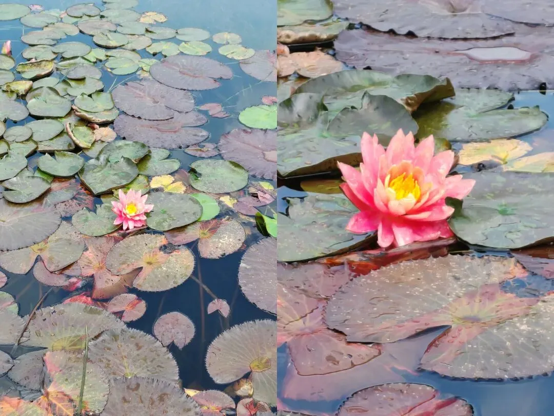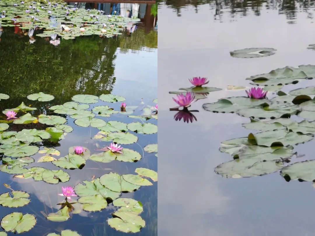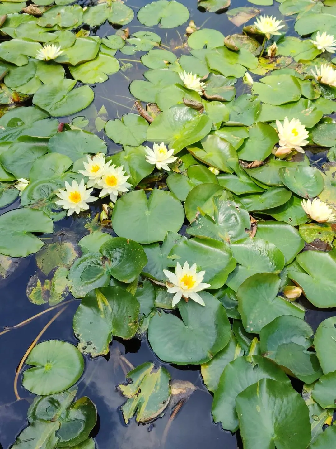 目前各种睡莲正在盛放中,占领了较大的水域面积,睡莲不但好看,还有净化水质的作用。