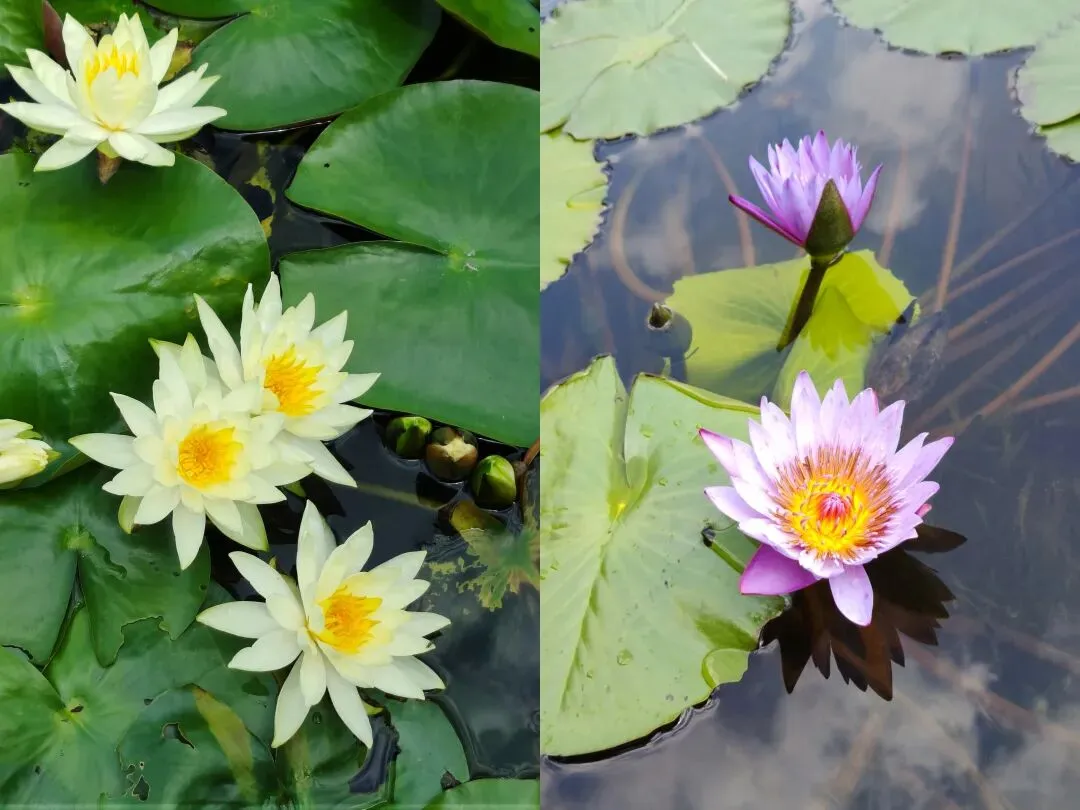 睡莲属的叶片浮水生长,有V形裂口;花朵浮水或挺水而出,花色丰富。