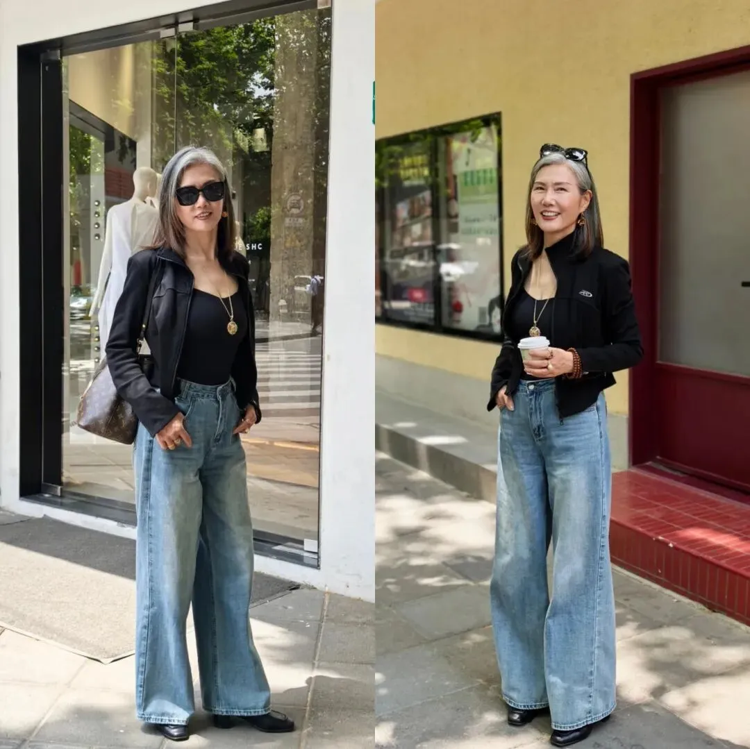 黑色皮夹克叠穿咖啡色毛衣,下半身选择蓝色牛仔阔腿裤,很难想象这么一套年轻人常见的搭配会出现在65岁的大龄女性身上,然而学会打破常规,才能从根本上改变自己的气质,轻松打破年龄界限,穿出年轻态与时尚感。