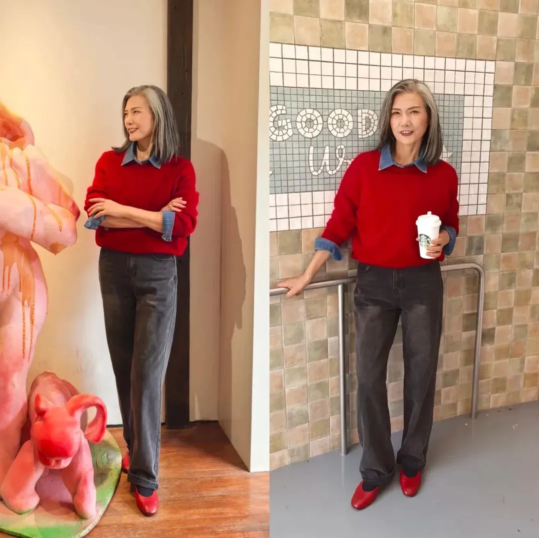 春季适合叠穿,大龄女性不一定要穿奶奶装,博主选择大红色的毛衣叠穿蓝色牛仔衬衫,用一条灰色高腰牛仔裤来削弱视觉冲击,红色圆头鞋来进行色彩呼应,就算是饱和度高的大红色,也能打造时髦又减龄的气质。
