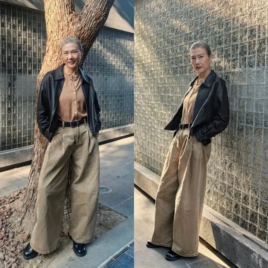 65岁穿出时髦减龄感有诀窍!硬朗黑色皮夹克奠定帅气基调,内搭咖啡色衬衫,沉稳又显质感。卡其色高腰阔腿休闲裤拉长腿部线条,增添随性。最后以黑色皮鞋收尾,整体风格统一又利落,巧妙打破年龄感,轻松化身时尚焦点。