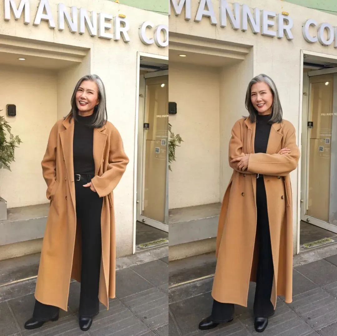 大龄女性想穿出温柔高级范儿,不妨试试驼色大衣。选一件质感上乘的驼色大衣,内搭黑色修身打底与高腰直筒西裤,外浅内深层次分明,巧妙遮肉显瘦。再配上一双简约皮鞋,整体造型优雅大气,轻松彰显不俗时尚品味。