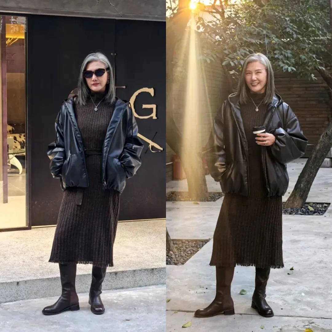 黑色皮夹克内搭深褐色针织连衣裙,用一根腰带勾勒出腰线位置,搭配深褐色长筒靴,大龄女性这么穿时髦保暖又实用。