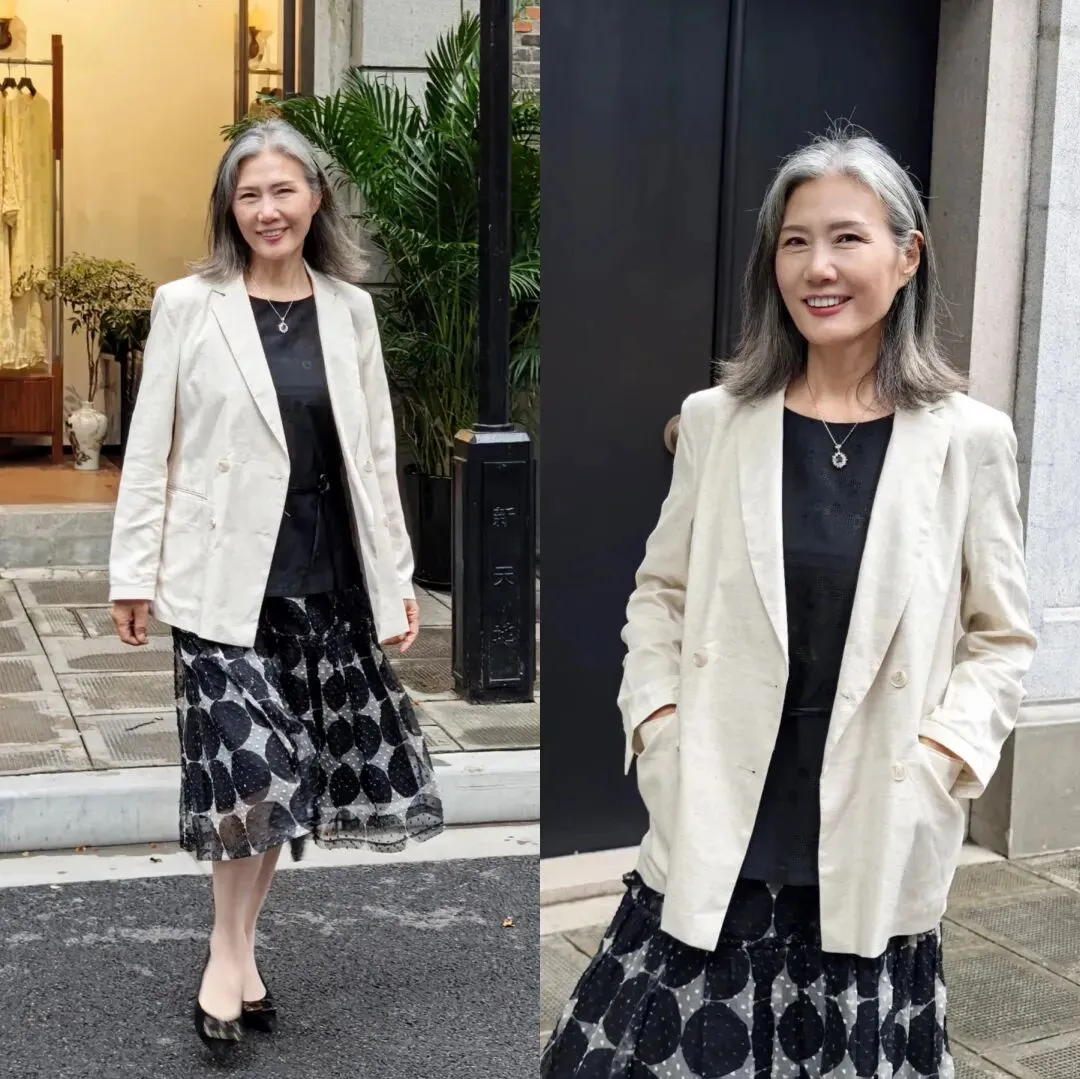 米白色小西装内搭黑色打底,下半身选择黑白波点网纱裙,大龄女性也可以打造优雅高级又显年轻的通勤风,利落干练又不失女人味。