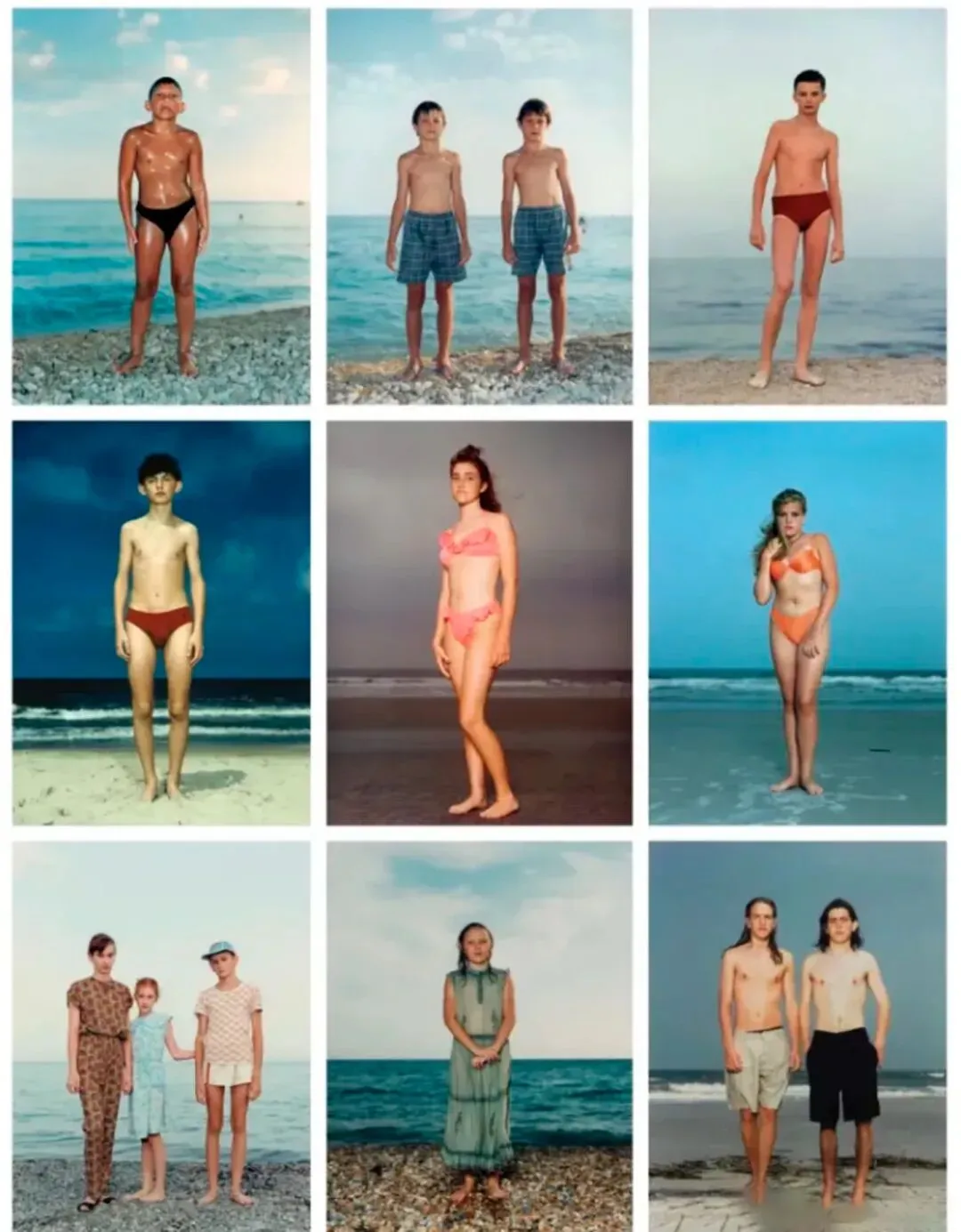 穿着泳装的青少年。一个个没有多余动作和表情的年轻人。照片外表的“冷”“僵硬”,更容易吸引人去注意一些细节:他们的穿着、肤色过渡、发型、雀斑、青春痘……这一切,让观众更能去观察这些人物的细节和真实的状态。