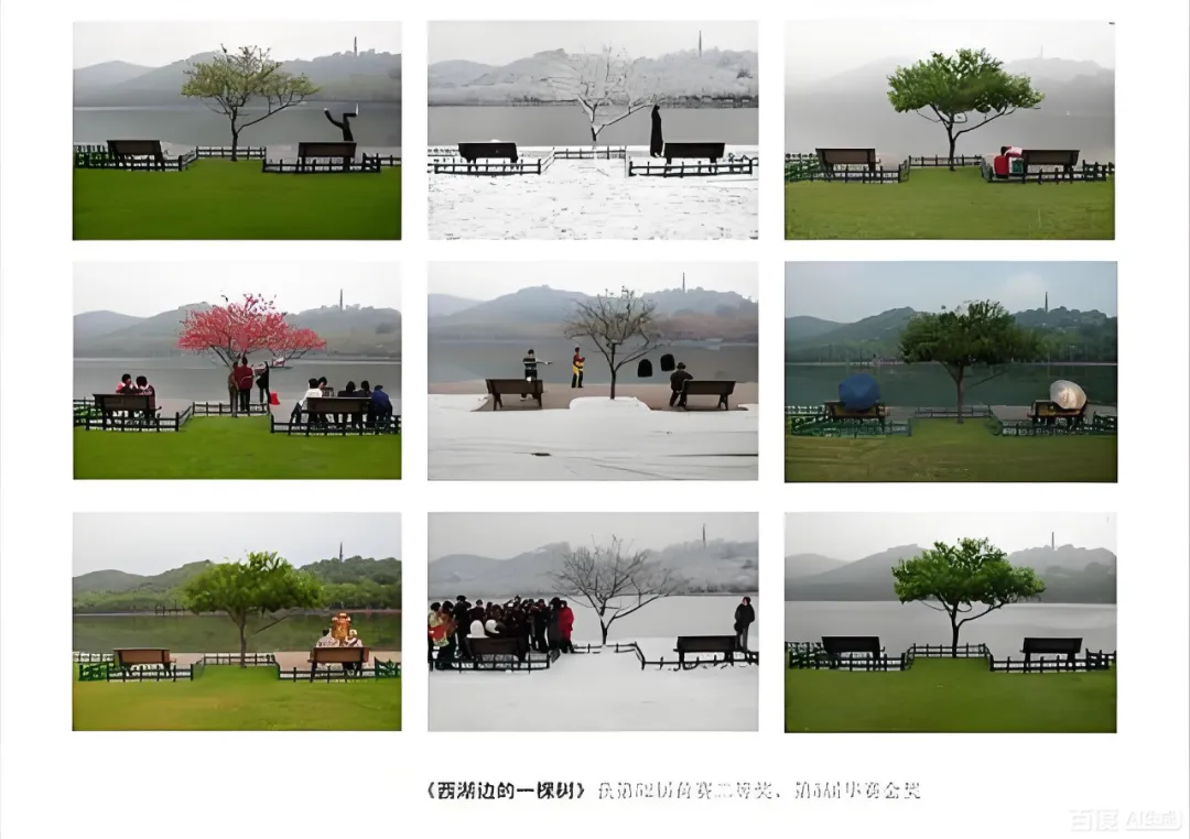 在国内,很多摄影师也在拍类似的作品。比如拍摄“西湖边的一棵树”的傅拥军老师,虽然画面平淡冷静,但展现了自然四季更迭与城市生活百态的交织,非常耐人寻味。下图。