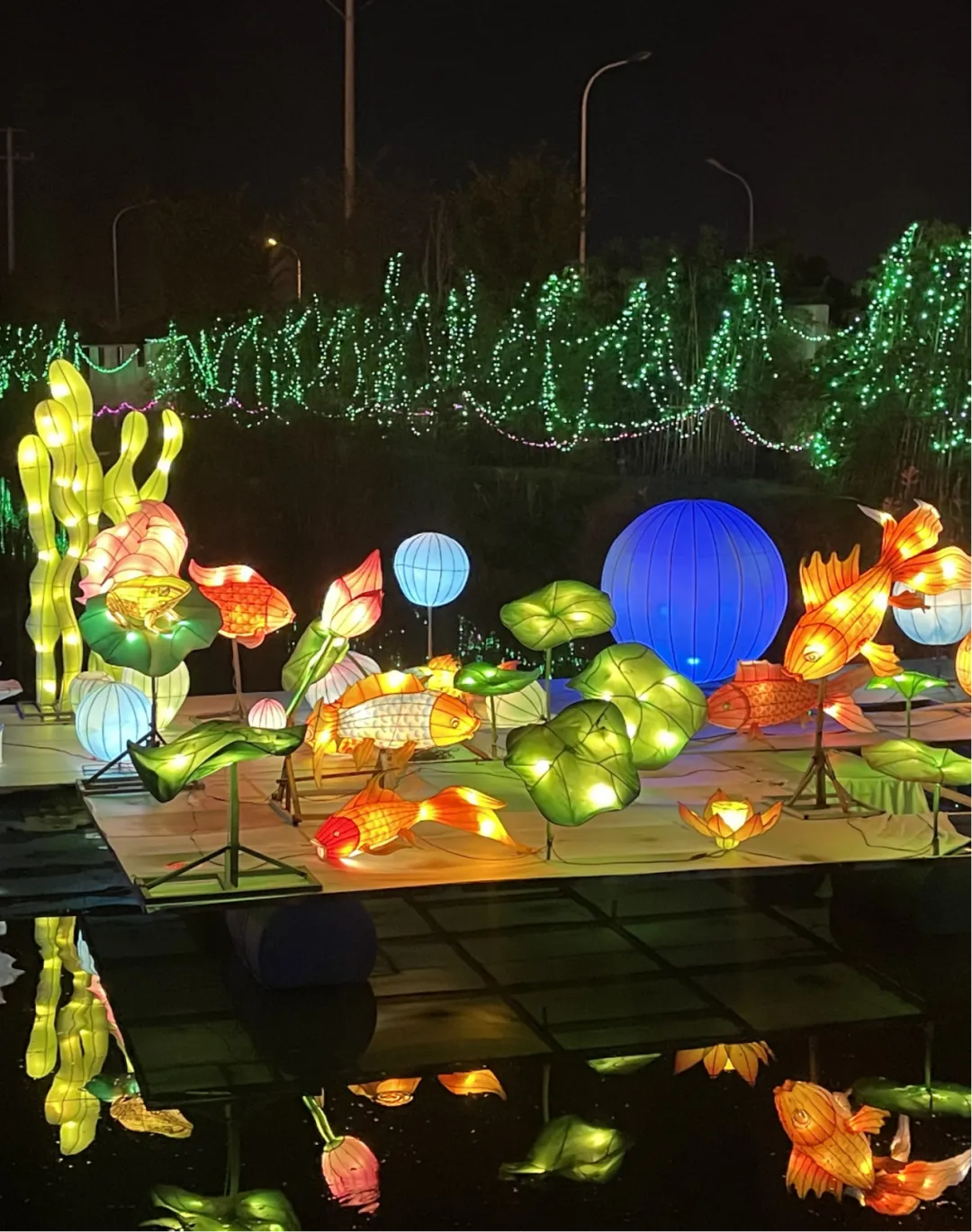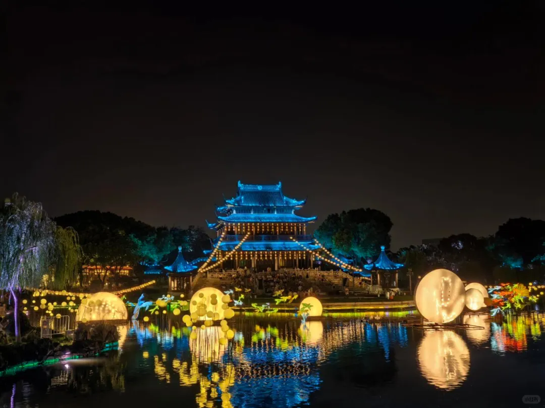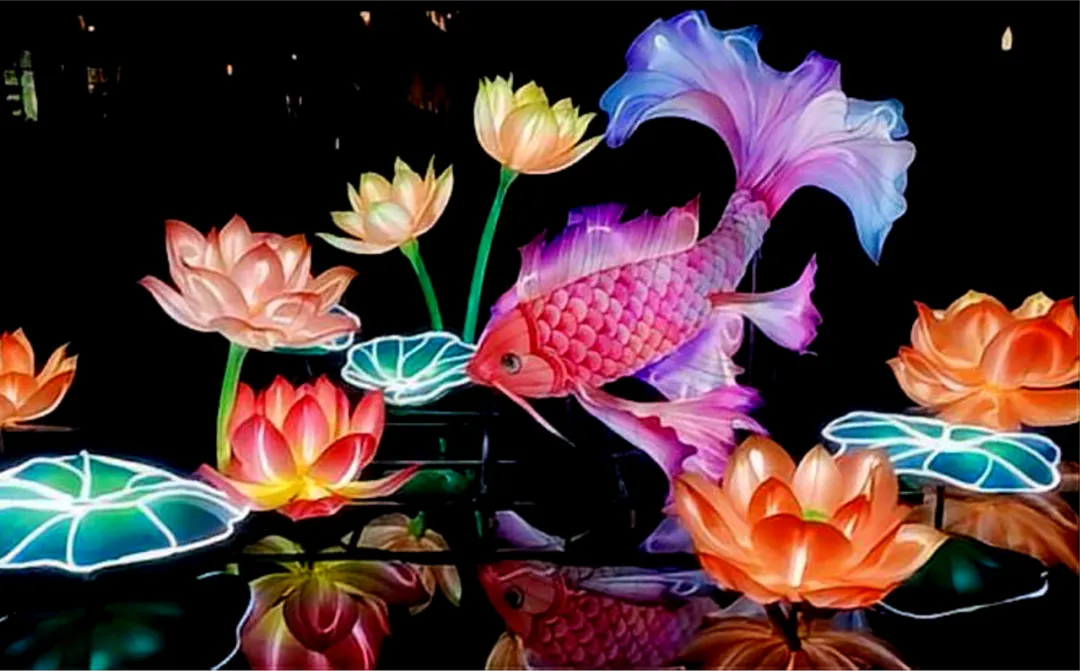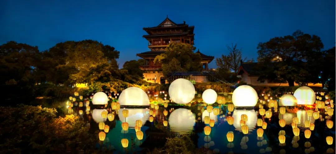 诗意的传统山水灯组、静谧水面上摇曳的荷花灯组,与一轮明月初升相映成趣。更设有灯笼心愿墙,许下新年祝福,希冀美好的心愿达成。