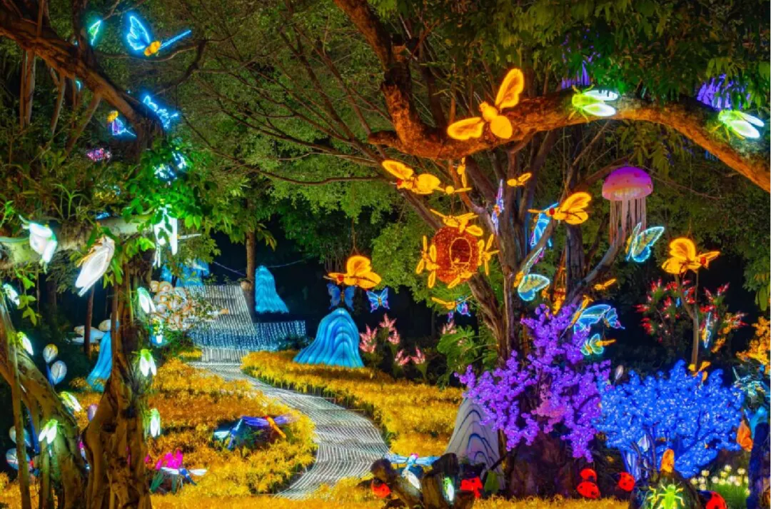步入这一区域,仿佛闯进一个被光影点亮的奇幻自然世界。仿真制作的七星瓢虫、蝴蝶、蚂蚱、螳螂等昆虫“栖息”在草丛树木之间,栩栩如生,灵动有趣。点点“萤火虫”光影在暗处温柔闪烁,配合树木枝条上点缀的星星灯火,共同营造出一片浪漫而神秘的光影森林。这里是孩子们的探索乐园,也是每个人找回童真与静谧的奇妙空间。