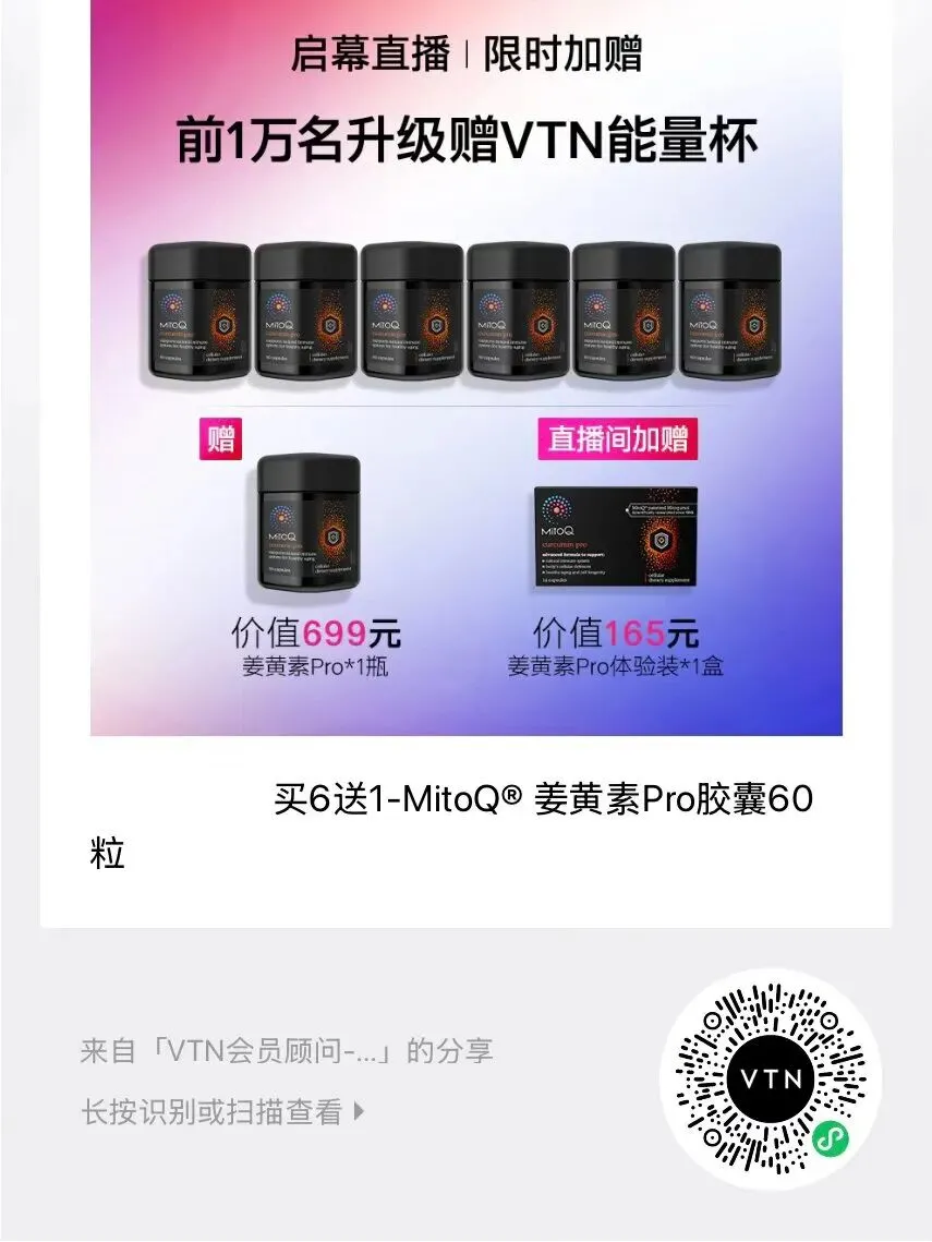当前位置:首页>美女资讯>VTN 3.8女神节-买6送1-MitoQ 姜黄素Pro胶囊60粒*6瓶送1瓶,直播间加赠姜黄素Pro体验装14粒