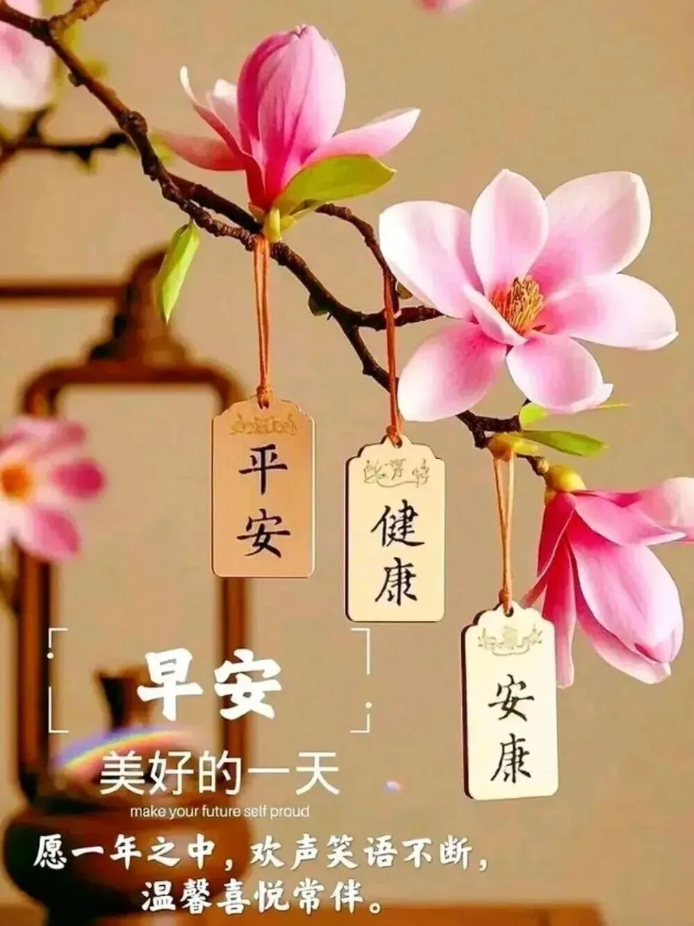 留下昨天的微笑,送上今天的祝福,期待明天的美好,让幸福健康同在,让吉祥平安相随!远思念,近相伴,真诚好友情不断。心相通,意相连,彼此问候暖心间。多保重,祝平安,吉祥快乐每一天!早安!