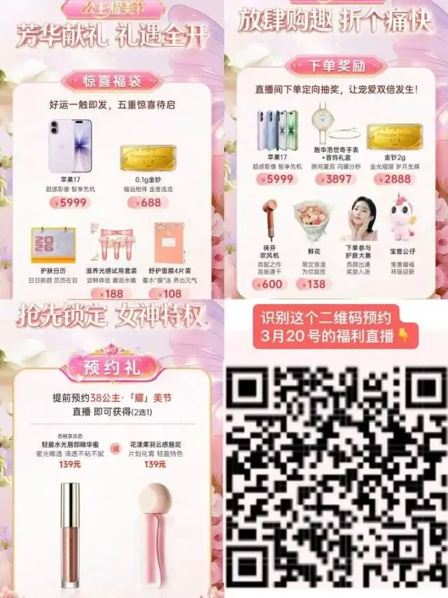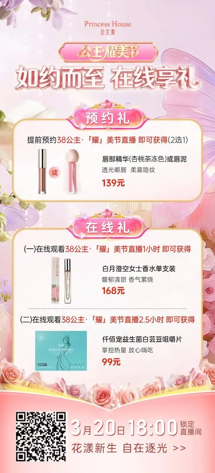 3月20日晚8点,公主家官方直播间,春日护肤专场重磅开启!这次福利全面加码,只为让你心动!下方扫码咨询官方护肤导师主播并预约直播,解锁四重限定惊喜: