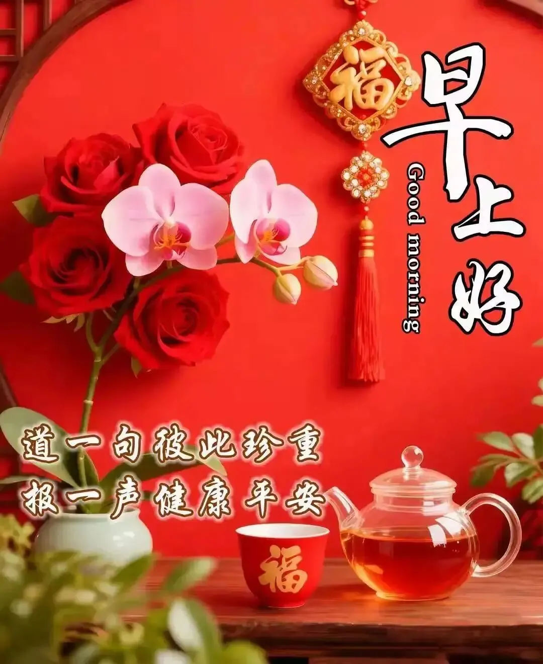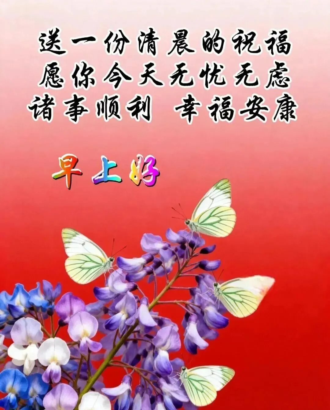 红花不忘绿叶情,清晨不忘送温馨。一句问候轻轻送,化作福气伴君行。祝你今天出门遇贵人,进门见喜神。早上好!