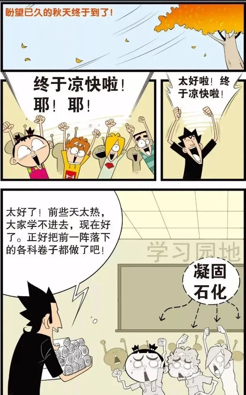 暑假期间是天气最热的时候,度过了炎炎夏日,同学们也终于开学了。上一次坐在教室还是非常闷热,这次就变成凉爽惬意了,同学们都非常开心,金老师也是。在第一节课上,金老师抱着一堆卷子走进了教室,由于前段时间天气太热,很多卷子都没有做,金老师趁着开学凉快要求学生们都补写之前的卷子。班上同学听到后瞬间石化,痛哭流涕。金老师看到此情此景后非常生气,想不到做卷子对他们来说这么痛苦,开学第一天就要做卷子,相信每个学生都会崩溃吧!