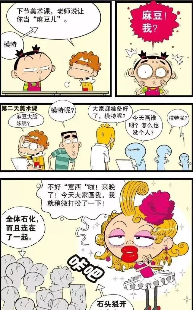 上节美术课是阿衰当人体模特,这节课就轮到大脸妹了,看到阿衰之前当人体模特如此辛苦,大脸妹听到这个消息后非常惊恐。第二天美术课上课,大家都已经准备好纸和笔,可是却迟迟等不到大脸妹的到来,如果你认为大脸妹是因为太害怕而不敢来那就大错特错了,只见一个浓妆艳抹,身披金发的妖艳女性走到了教室里,要不是大脸妹说话,根本就没人敢认她,大脸妹着实太臭美了。