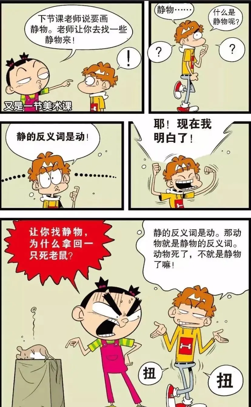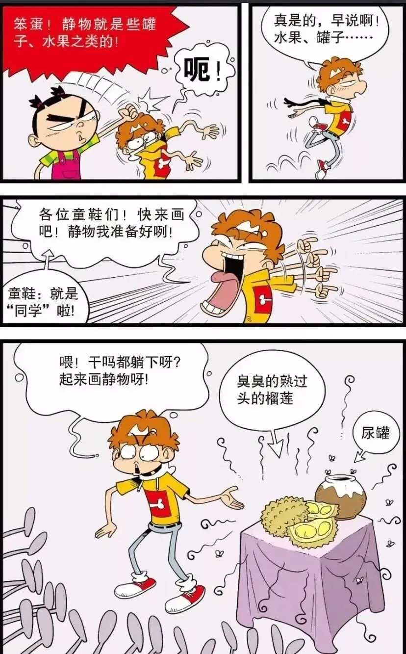 又是一节美术课,这节课老师不再要求画人体画像了,而是画静物。可是没想到阿衰理解的静物竟然是动物的反义词,于是他找到了一只死掉的老鼠放在展示台上,大脸妹气得锤阿衰的脑袋。在大脸妹的解释下,阿衰才知道,原来是要找有关水果罐子之类的东西,可是没想到他准备的竟然是熟过头的臭榴莲和尿罐!熏得班上同学们全部晕倒。