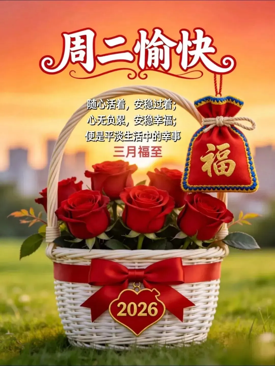 星期二,早上好!晨风吹醒岁月,暖阳温润时光。寄一份悠悠期盼,朝朝暮暮皆是喜乐安宁;递一份切切深情,丝丝缕缕尽是顺意安康。日子过的是心情,活的是心态,不纠结过往,不焦虑未来,晨起笑一笑,健康没烦恼。祝您2026年一帆顺风,六六大顺,事事顺遂,一顺百顺。早上好!