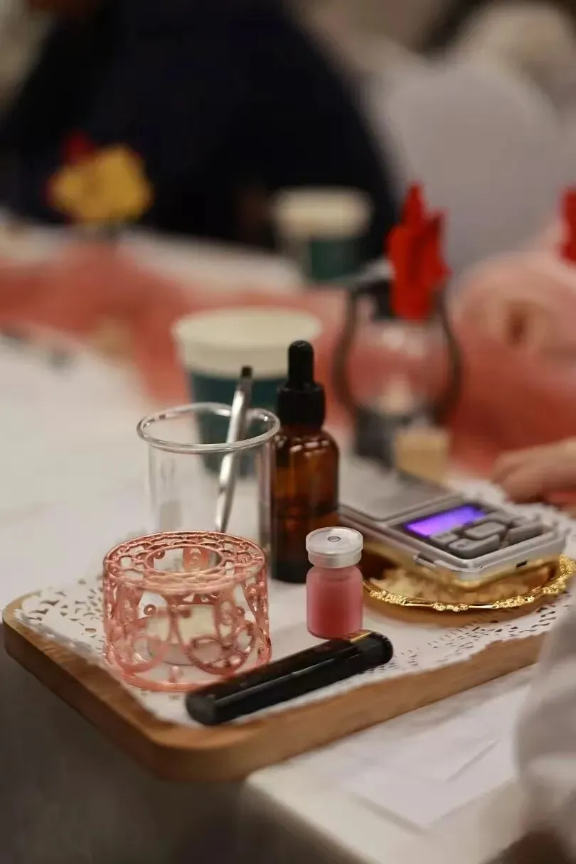 融化蜡基,滴入喜欢的精油,静静等待凝固。有人选择薰衣草安神,有人偏爱甜橙的明媚,还有人将玫瑰和柠檬草混合,调配出属于自己的独特香气。