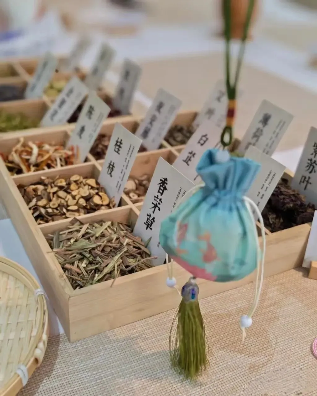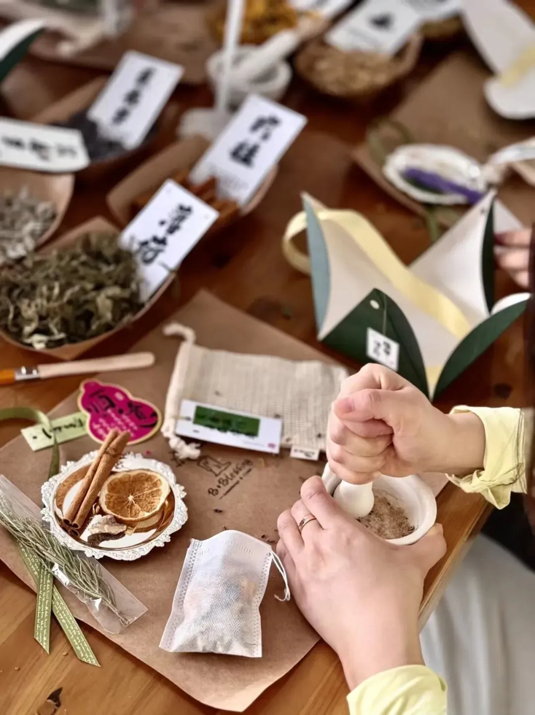 研磨、配比、装袋、封口——每一个香囊,都是一份健康的祝福。有人做好挂在自己包上,有人准备带回去送给妈妈。