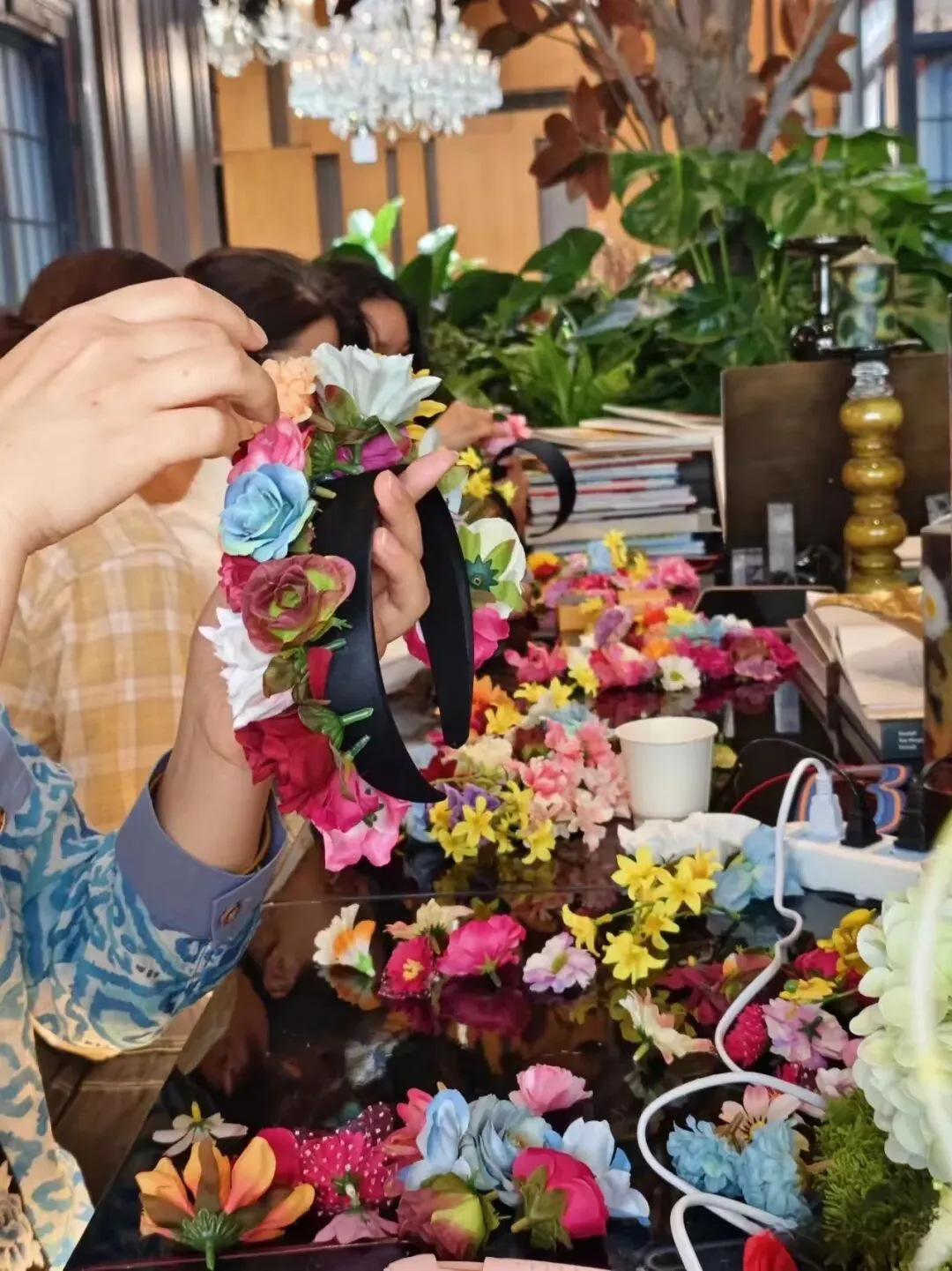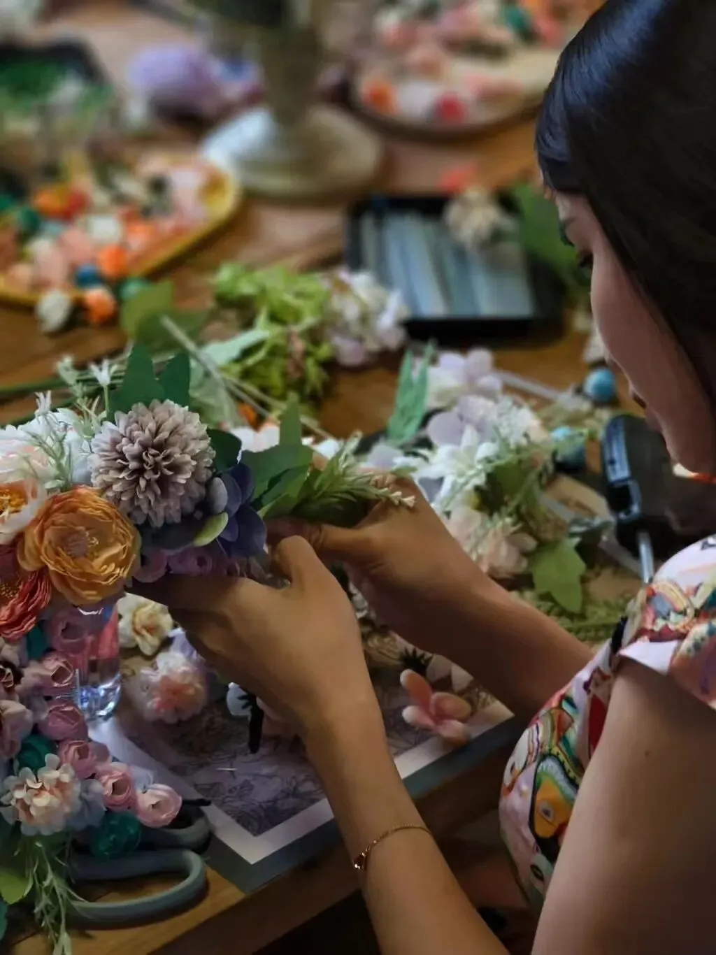 绢花、珠翠、发簪、丝线——在老师的指导下,女神们亲手制作属于自己的非遗簪花。配色、组合、固定,每一步都考验着审美与耐心。