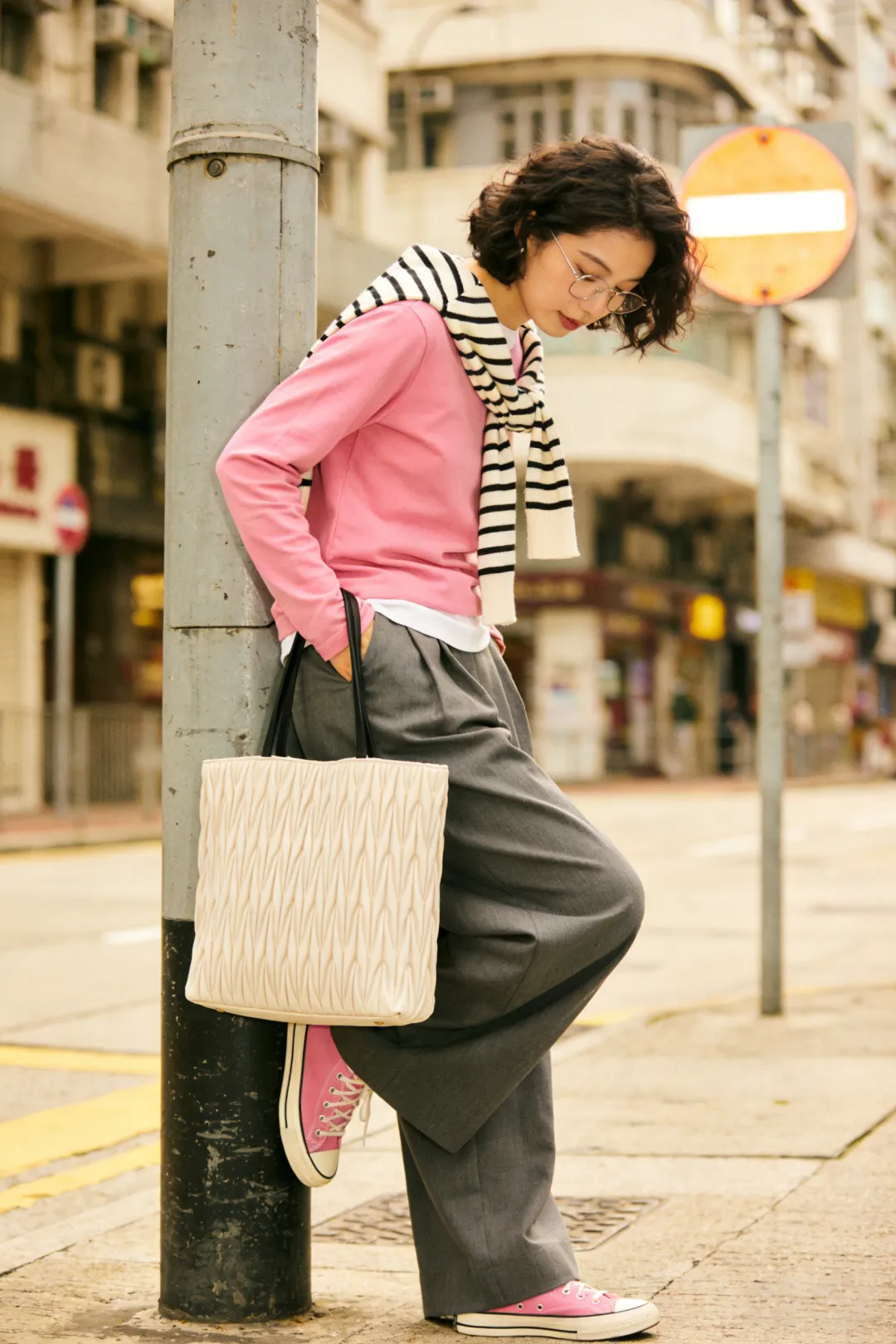 人物:一位都市女性,短发,微卷,她戴着细框眼镜,手提褶皱纹理的米色包包(手提带子,狭窄,黑色),粉色长袖上衣,内搭白色衣服,肩膀上搭着黑白条纹的薄毛衣披肩,灰色的阔腿裤,粉色的匡威运动鞋,活力十足。