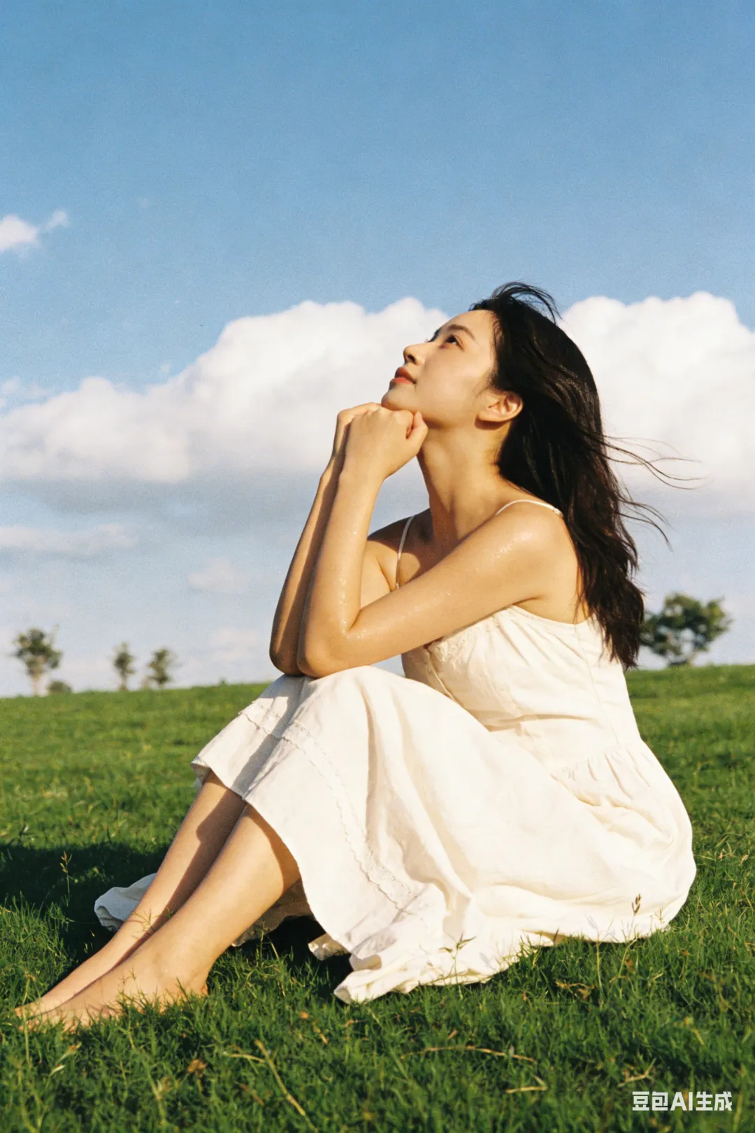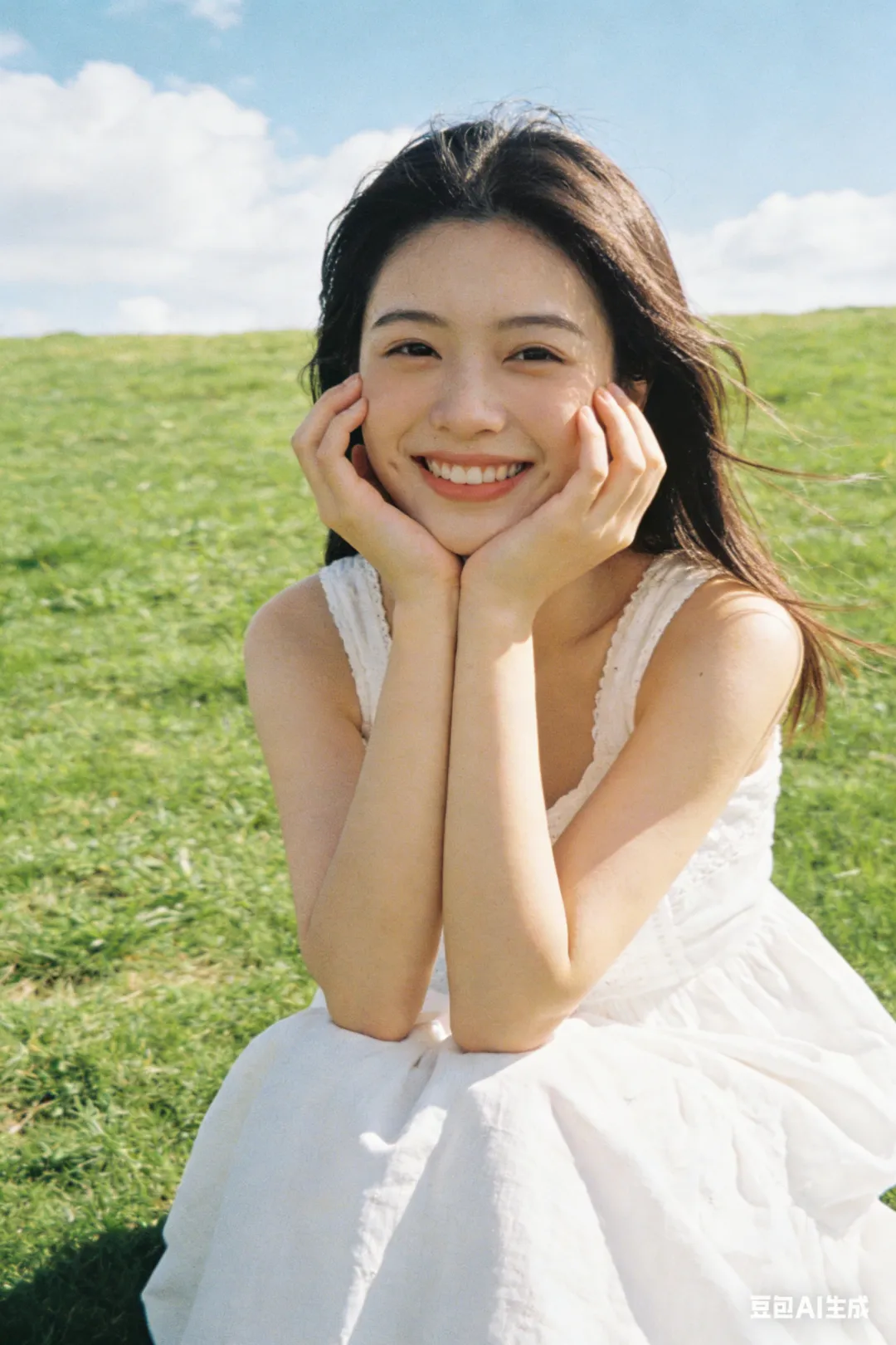 帮我生成一套春日写真,一个23岁女孩,草坪,蓝天,自由烂漫,日系暖调胶片感,柔和高光,轻微颗粒感,清新通透,比例2:3。
