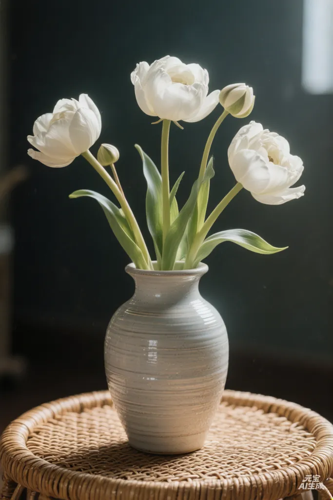 提示词:主体是四朵白色郁金香,插在浅灰色陶瓷花瓶里,放在编织圆垫上。背景是纯黑或深灰暗调,光线柔和侧逆光,风格是极简静物摄影,低饱和度色调,强调光影和材质细节。技术参数是8K高清,焦点精准,景深适中。整体氛围静谧雅致,带点北欧极简美学。