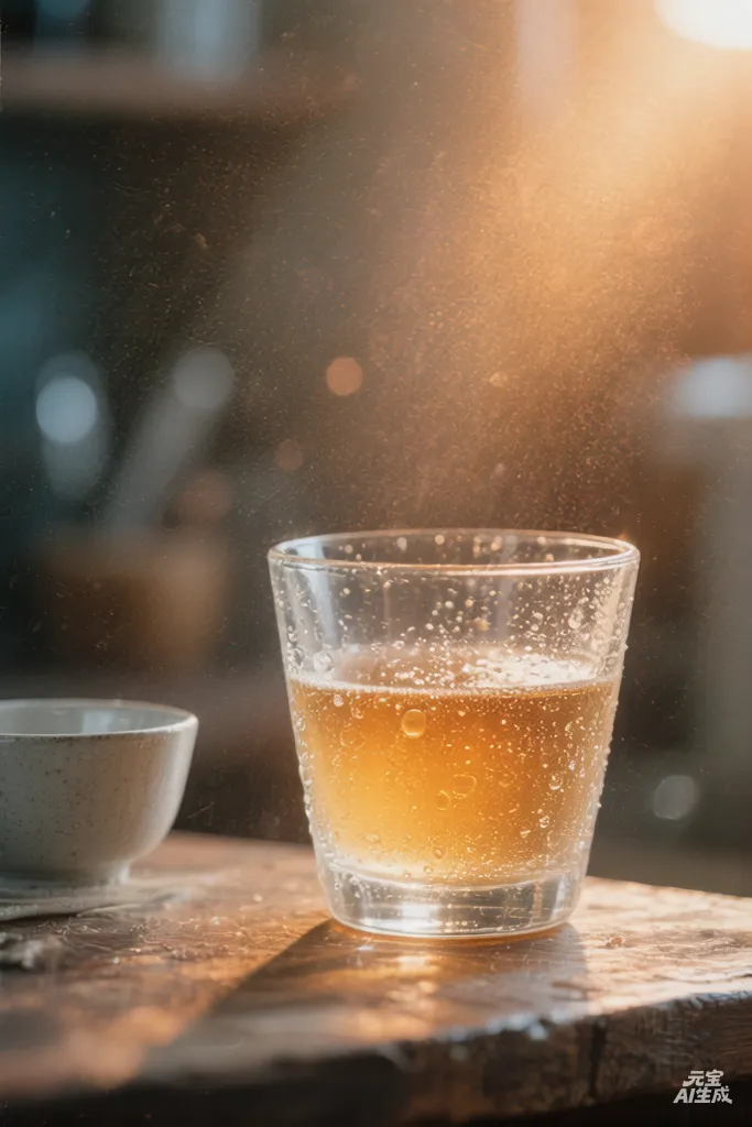 提示词:一杯琥珀色气泡饮料的玻璃杯,杯壁有水珠,放在木质桌面上,旁边有米色粗陶碗。柔和窗光从右侧打来,背景是暖黄光晕,风格是低饱和暖调,8K高清,强调玻璃和木质的质感。
