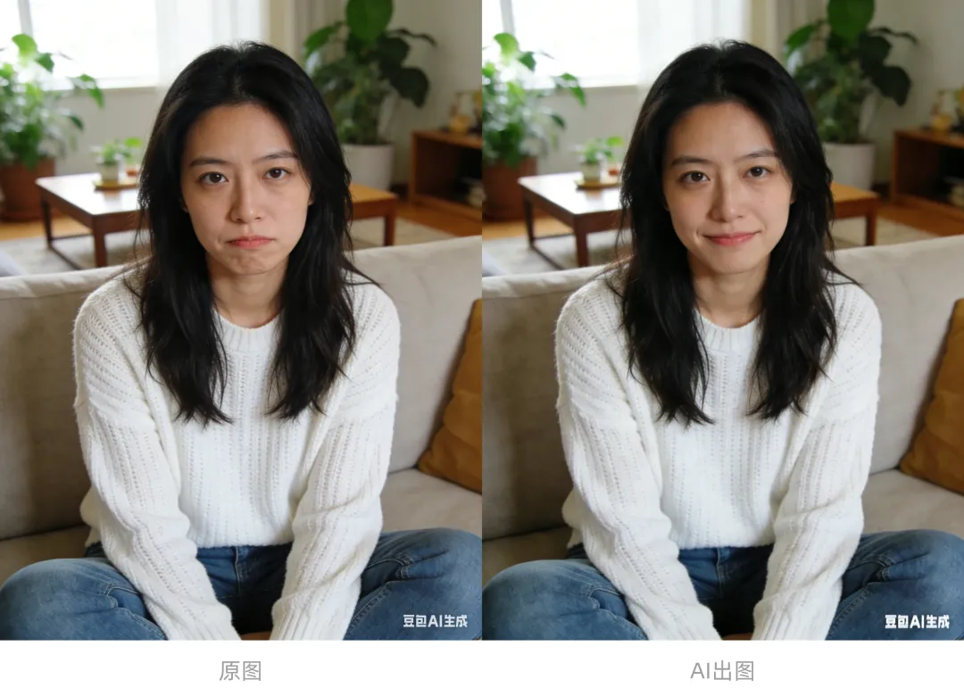 生动化处理人物表情,将当前表情转化为治愈系微笑。请让嘴角两侧呈现自然上扬的弧度,配合眼轮匝肌微微收缩产生自然的卧蚕,增加瞳孔的清澈度让眼神更灵动柔和。