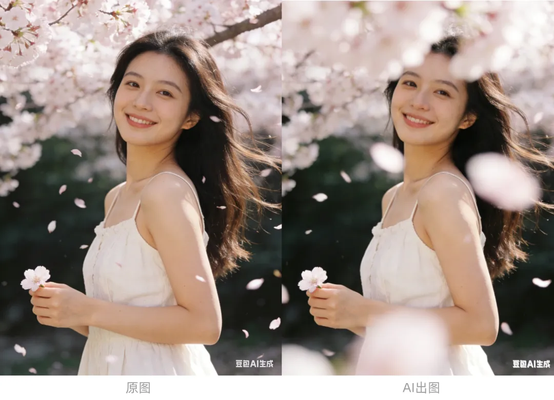 为照片增添三维空间范围特效。请在画面的前后景中错落分布飘落的樱花花瓣,靠近镜头处的花瓣需带有动态模糊效果,赋予画面浓郁的浪漫氛围与故事感。