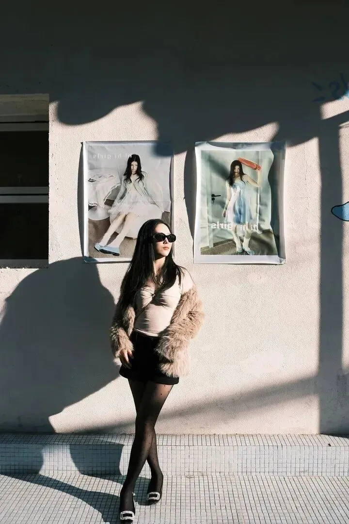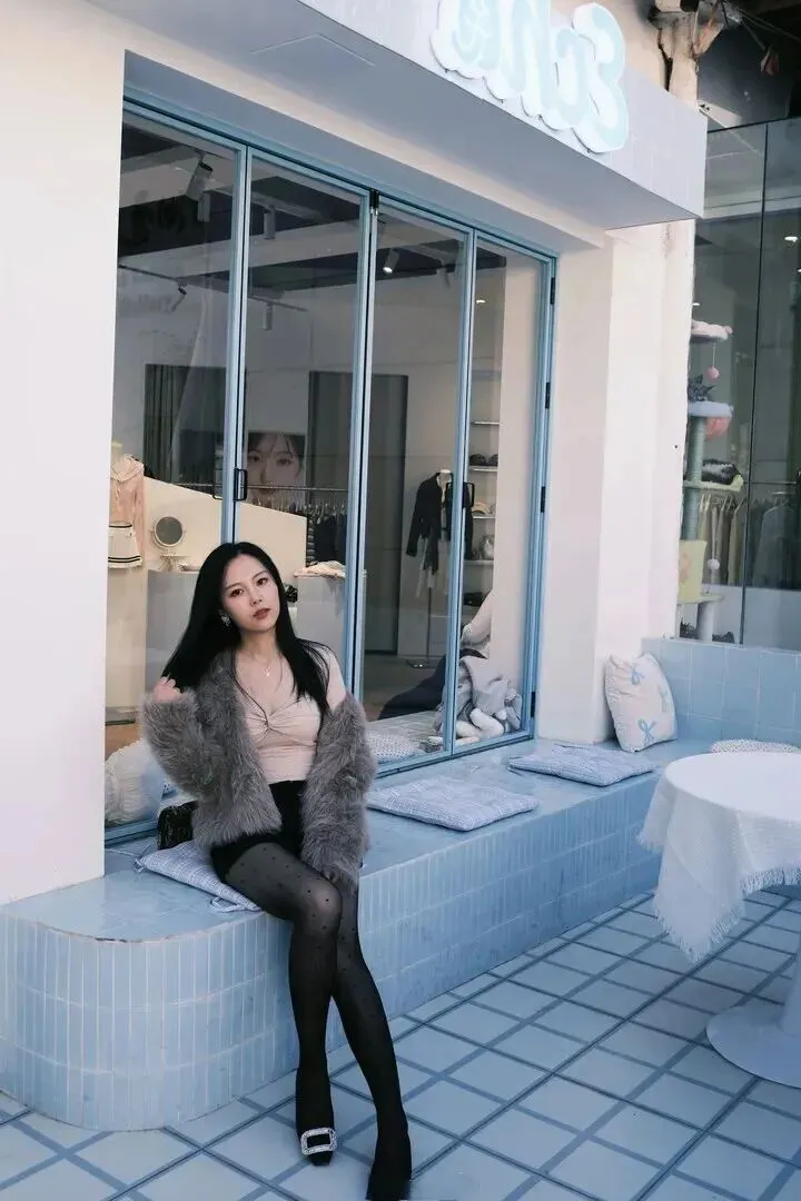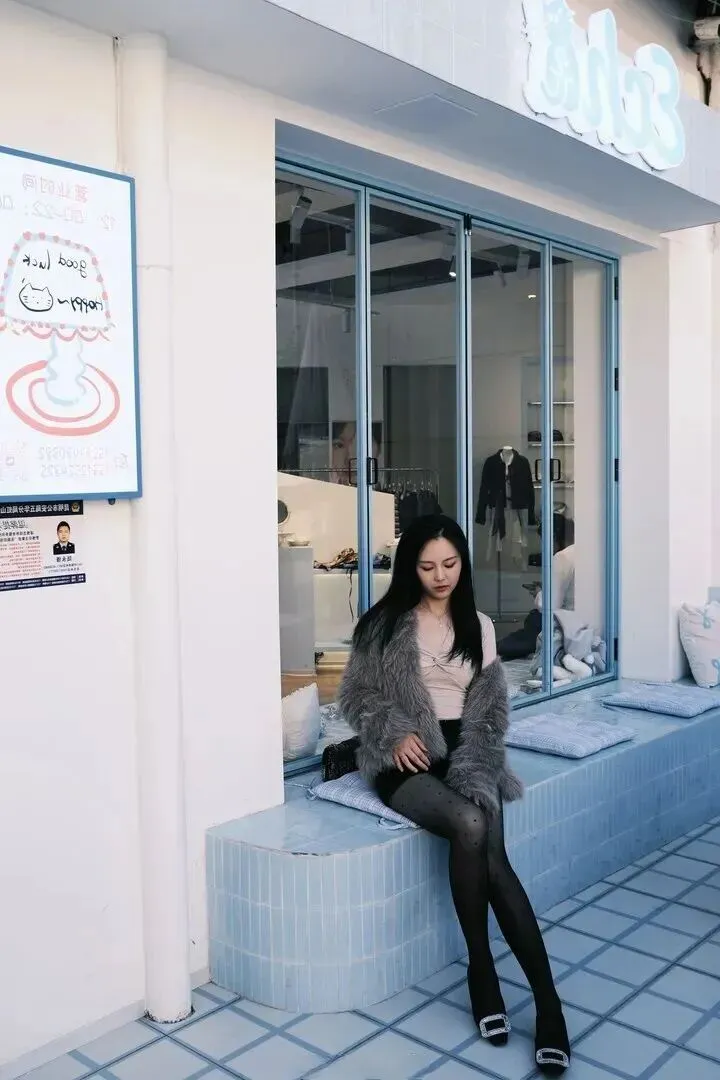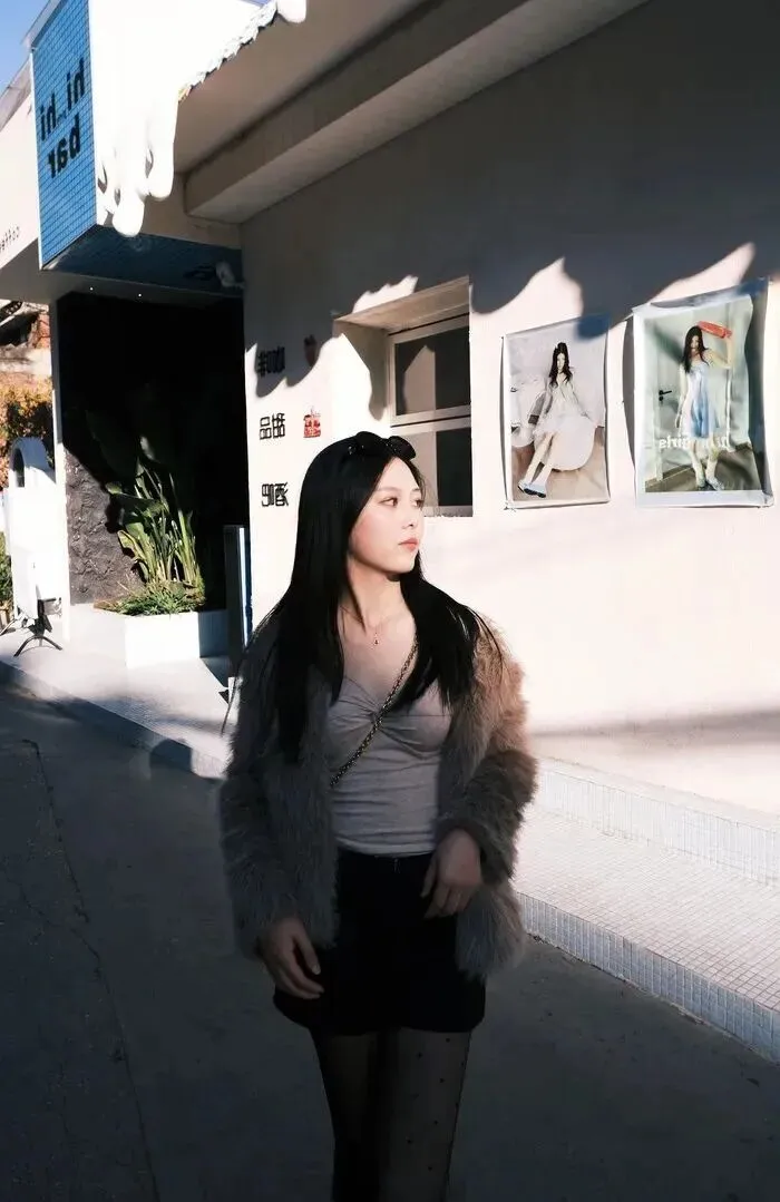 第一眼就被人身上一件浅卡其色仿皮草外套所吸引。绒毛状的感觉看上去就很舒服,像是拥有一团暖烘烘的云。这种外套秋冬穿简直太聪明了,既能防风又能不出肉眼可见的肥肉,还悄悄地让气质提升起来。她选择的长度正好盖过腰部,整个人的身材比例很好,轻松就穿出了高级感。