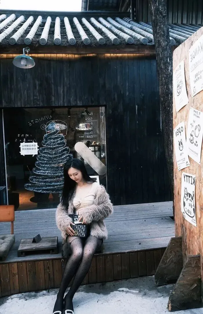 她站在一个用小木头做房屋的小木屋里,坐在一个小木台上,手里拿着一个黑色菱格的包,在这个小木屋里边活动着。明明穿的简单却在配饰上下足了功夫,这样的反差让人觉得非常可爱。坐姿非常轻松自在,双腿交叉而坐,一目了然地看出是一个在享受当下的人。