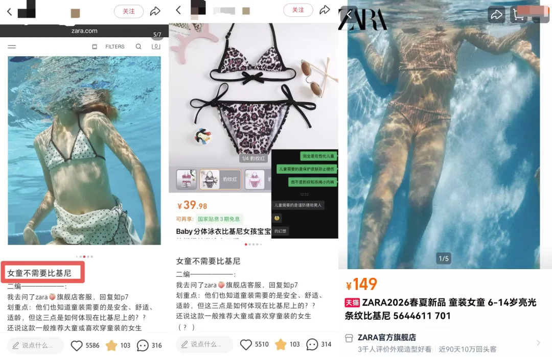其中,服装品牌ZARA售卖的“三点式”儿童泳衣,也被网友质疑过于性感。