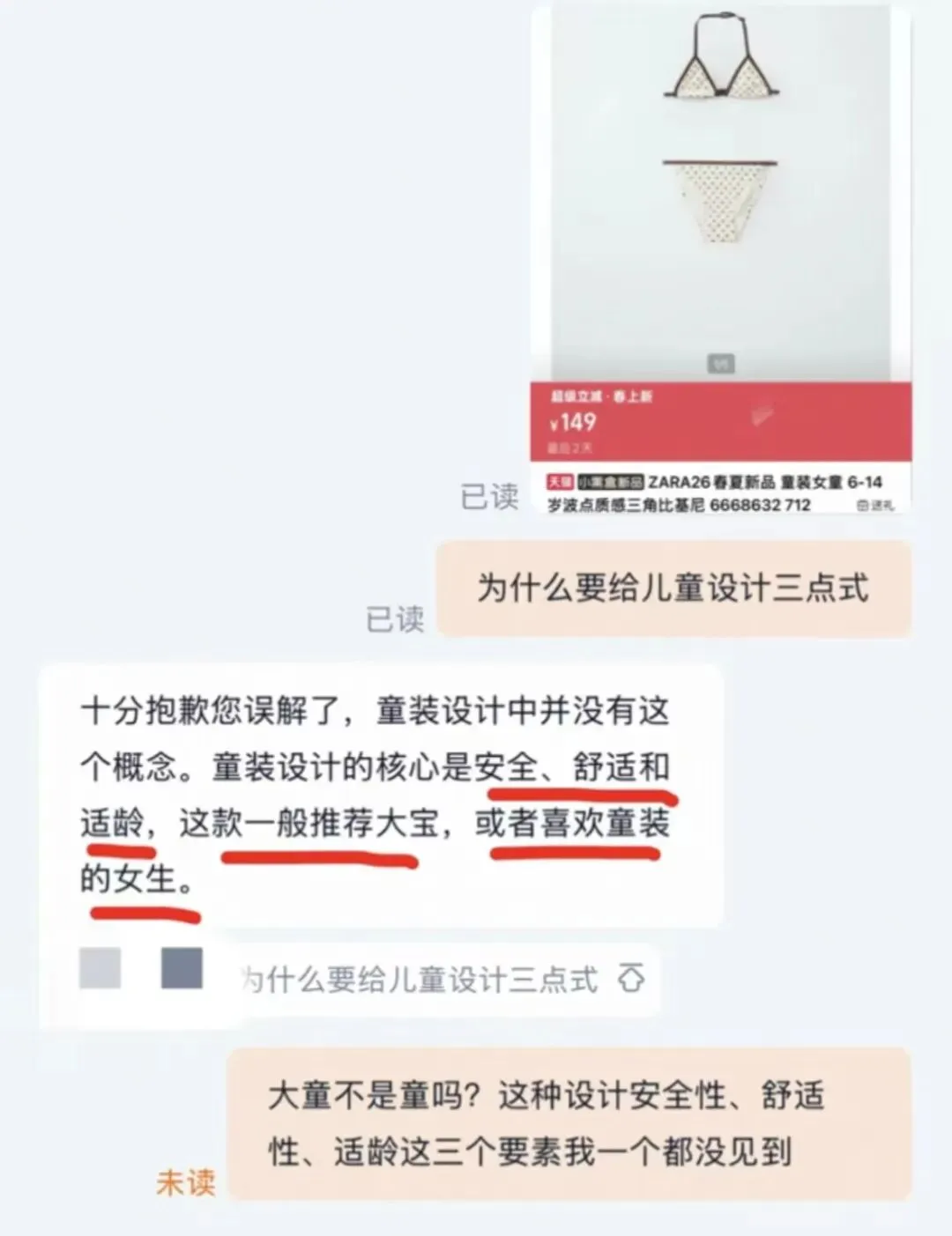 博主曾向ZARA客服咨询店内在售的一款女童比基尼,询问“为什么要给儿童设计三点式”。