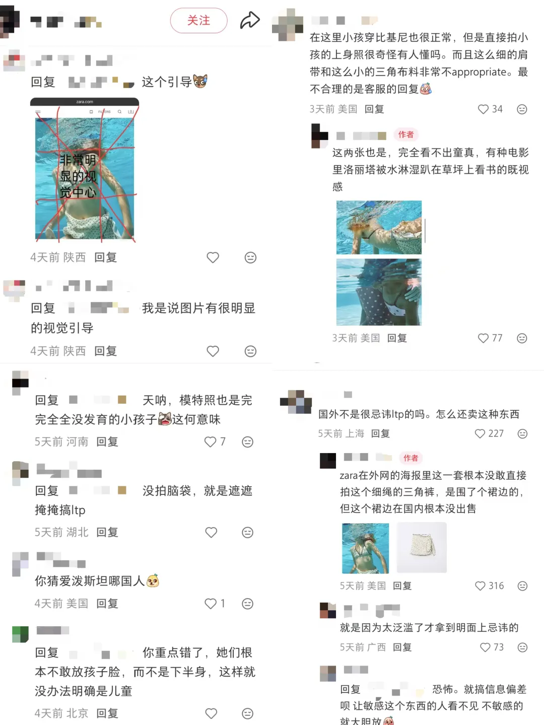 此外,ZARA部分海报的拍摄角度也被网友质疑存在视觉引导,“拍小孩的上身照很奇怪”,“完全看不出童真”,“遮遮掩掩搞ltp”。