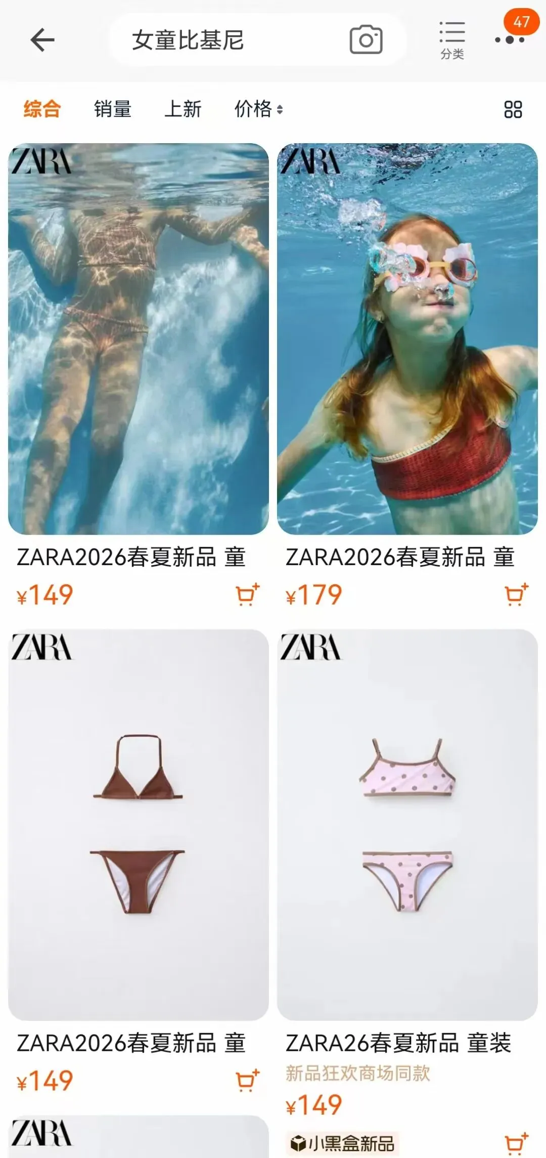 天眼妹在电商平台的ZARA官方旗舰店以“女童比基尼”为关键词搜索,共发现7款在售商品。