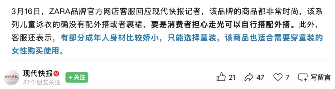 现代快报也曾就ZARA售卖“三点式”儿童泳衣一事采访网店客服,对方表示,该系列儿童泳衣的确没有配外搭或者裹裙,要是消费者担心走光可以自行搭配外搭