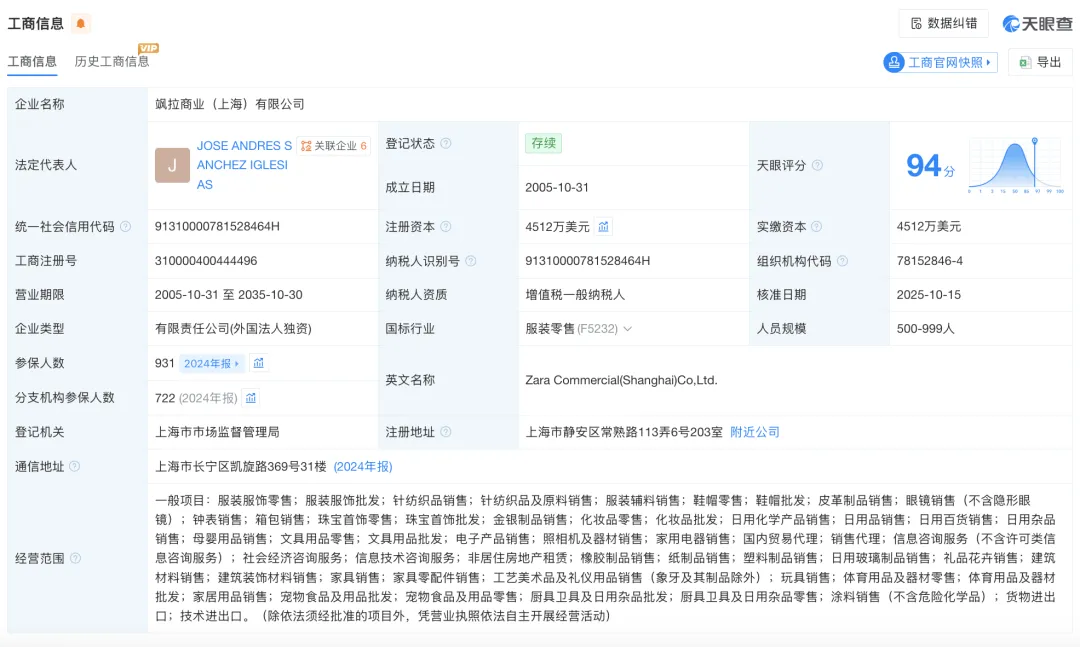 天眼查显示,ZARA中国关联公司【飒拉商业(上海)有限公司】成立于2005年10月,注册资本4512万美元,经营范围包括服装服饰零售、服装服饰批发、针纺织品销售等。