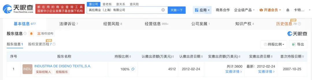 股东信息显示,该公司由INDUSTRIA DE DISENO TEXTIL,S.A.全资持股。
