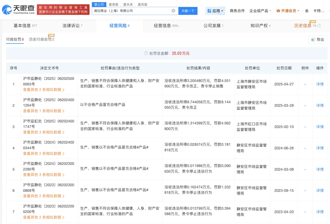经营风险信息显示,该公司曾多次被罚,原因包括:以不合格产品冒充合格产品,生产、销售不符合保障人体健康,人身、财产安全的国家标准、行业标准的产品。