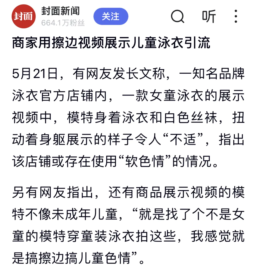 据封面新闻,去年5月,有博主在社交平台投诉,一知名品牌泳衣官方店铺内,一款女童泳衣的展示视频存在“擦边软色情”的嫌疑。