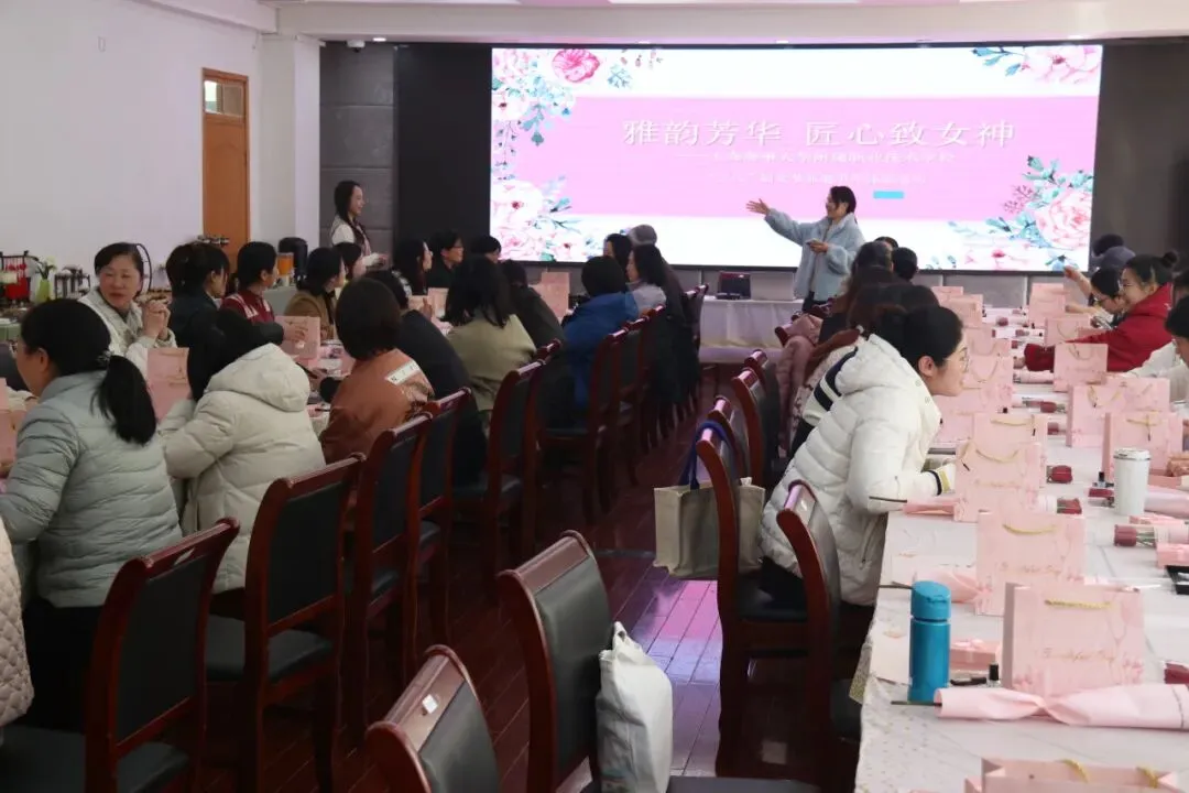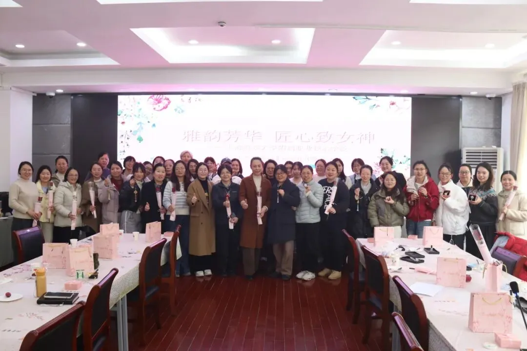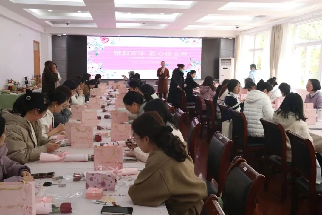 阳春三月,芳华绽放。为庆祝三八国际劳动妇女节,丰富女教职工精神文化生活,传承中华优秀传统文化,3 月 13 日下午 13:00,校工会举办了以“雅韵芳华,匠心致女神”为主题的三八妇女节庆祝活动。本次活动以非遗手作为载体,开展宋锦挂件、螺钿胸针、手链制作体验,学校女教职工欢聚一堂,在指尖匠心中共度温馨雅致的节日时光。