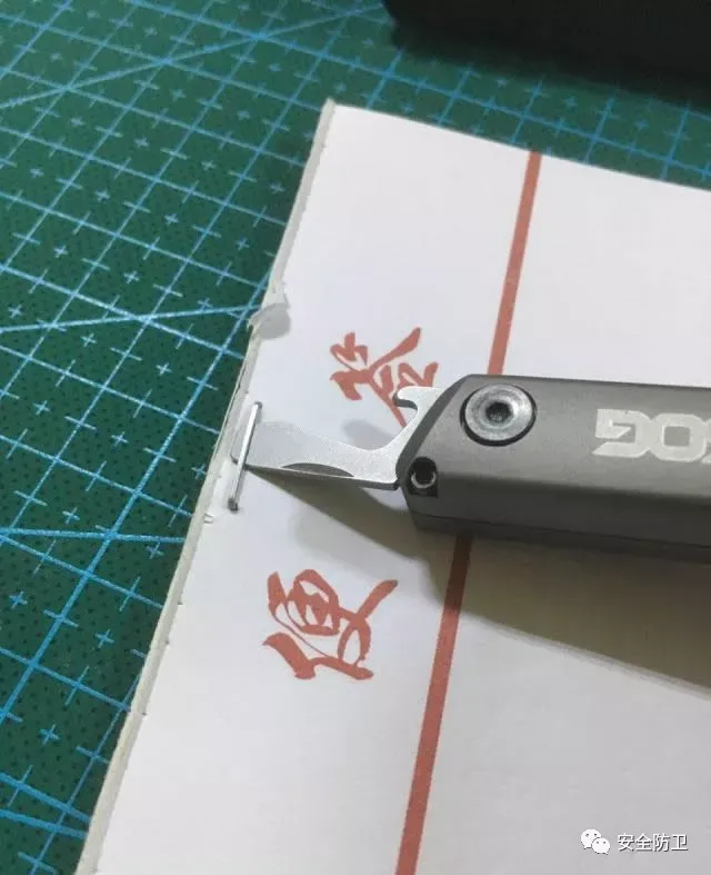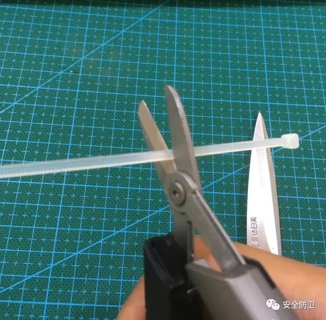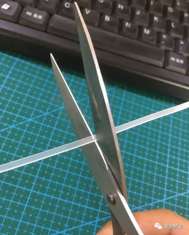 跳过最简单的纸张,先来尼龙扎带,都是一刀过,剪口平直,但是有个小细节,普通剪刀咬住扎带的时候向前滑了一端距离才被剪断的,剪断后还把扎带一头弹出好远,而Q1几乎没有一点顿挫感直接剪断,断的一头直接垂直掉落在桌面上,这次较量Q1略胜一筹。
