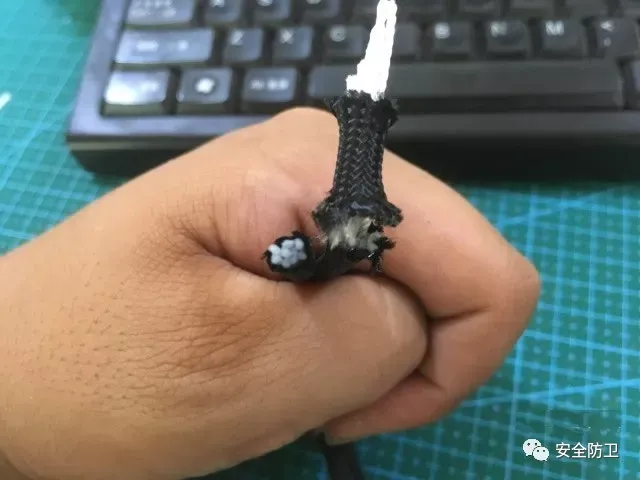 最后试下有韧性的东西,7芯伞兵绳,据说一根4mm的伞绳可以承受100kg的拉力,咱们试一下,Q1毫无悬念的轻松咬住,没有一点迟疑的剪断伞绳,而普通剪刀因为打滑仅剪断了绳子的一半,而且剪口凌乱,这次较量Q1完胜。(左Q1右普通剪刀)